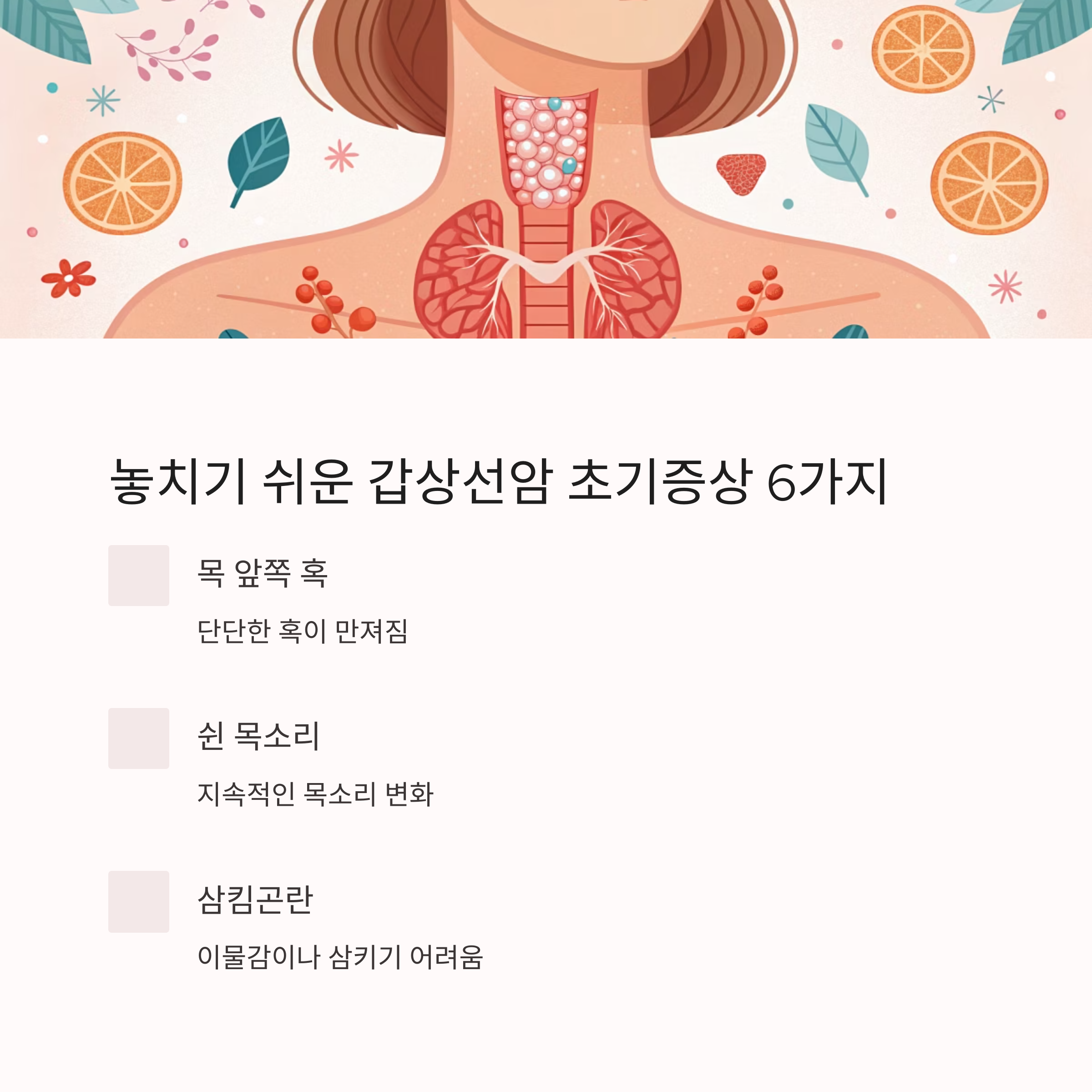 안녕하세요, 건강에 관심 많은 여러분. 혹시 최근 건강검진에서 ‘결절’이라는 단어를 들어보셨나요? 저도 몇 년 전 건강검진에서 목에 혹이 있다는 말을 들었을 때, 괜찮을 거라며 넘겼던 기억이 납니다. 하지만 그 혹이 갑상선암의 초기 신호일 수도 있다는 사실, 알고 계셨나요? 갑상선암은 대부분 조용히, 증상 없이 자라기 때문에 조기 발견이 어려운 질환 중 하나입니다. 하지만 미세한 변화에 주의를 기울이면, 위험 신호를 조기에 포착할 수 있어요. 오늘은 ‘놓치기 쉬운 갑상선암 초기증상 6가지’를 중심으로, 누구나 이해할 수 있도록 쉽고 자세하게 알려드릴게요.
