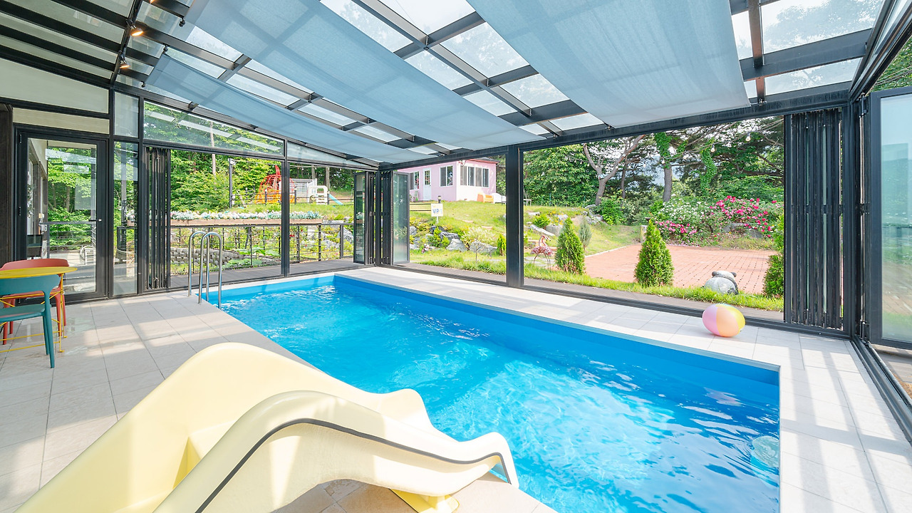 펜션 앞 넓은 잔디 정원과 워터 슬라이드가 있는 야외 수영장도 구비되어 있습니다.