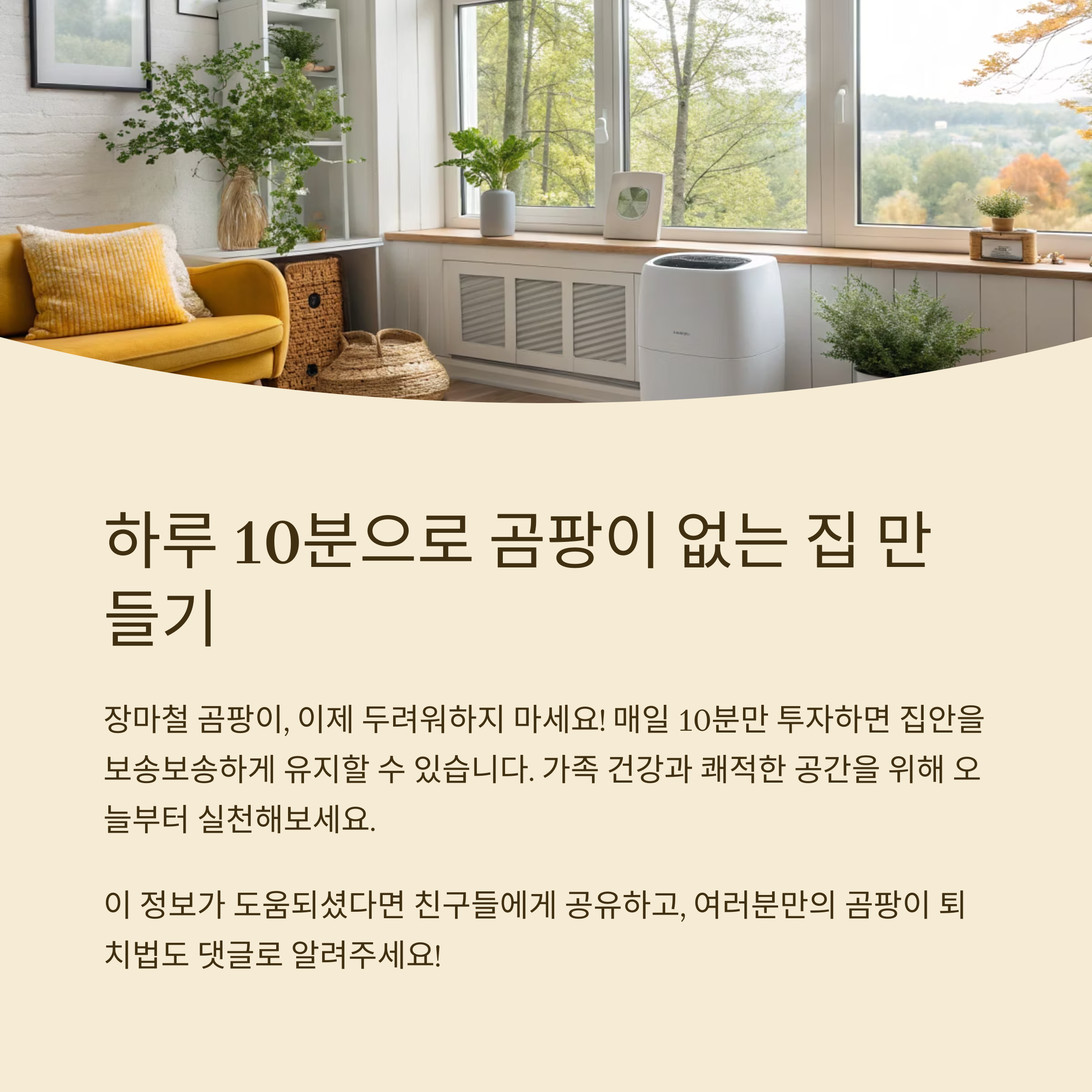 욕실 환기, 세탁기 건조, 제습기 사용, 창틀 청소 등 10분만 투자해도 큰 효과가 있습니다.