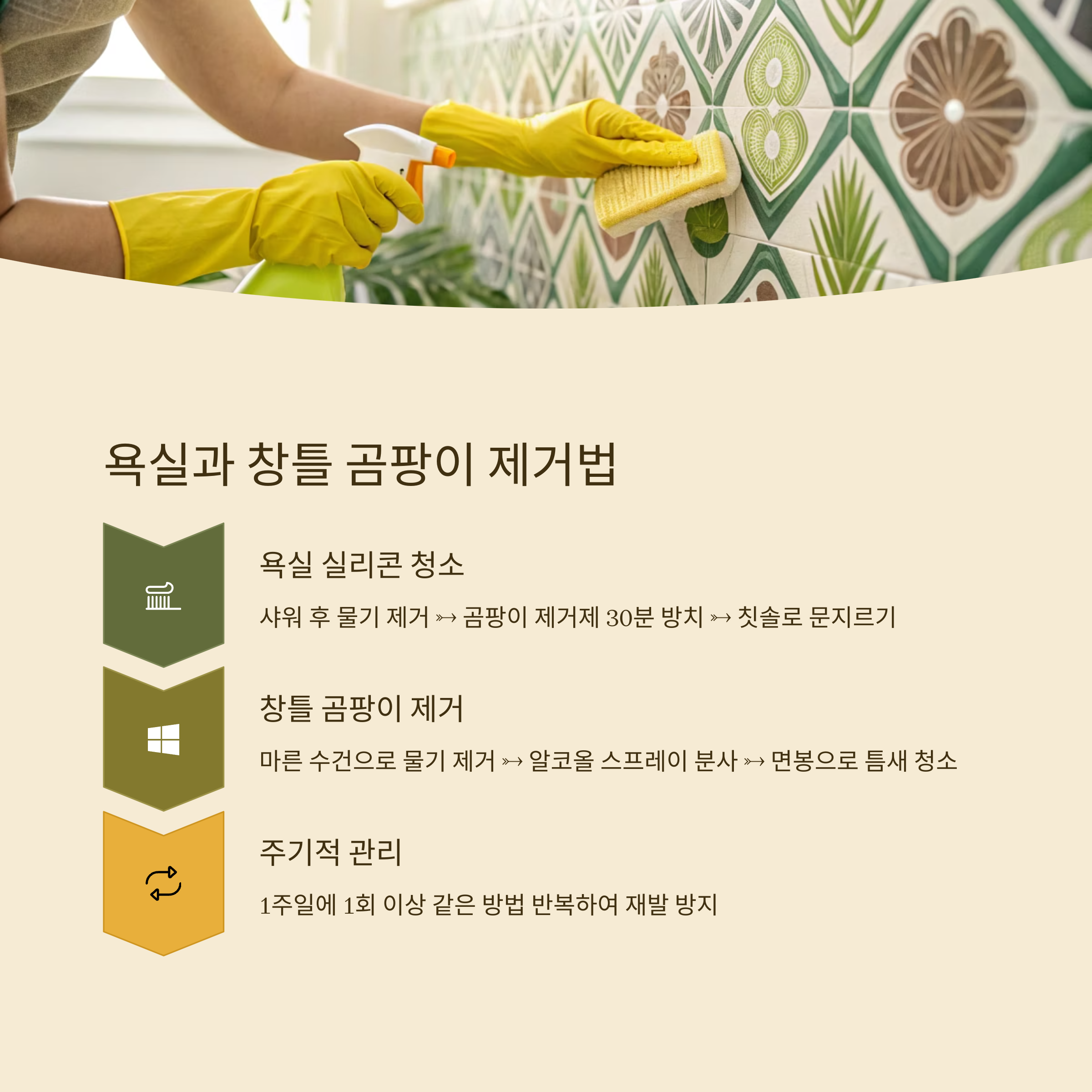 | 2단계: 곰팡이 제거제 분사 | 천연 재료나 전용 스프레이를 뿌린 뒤 30분 방치 |