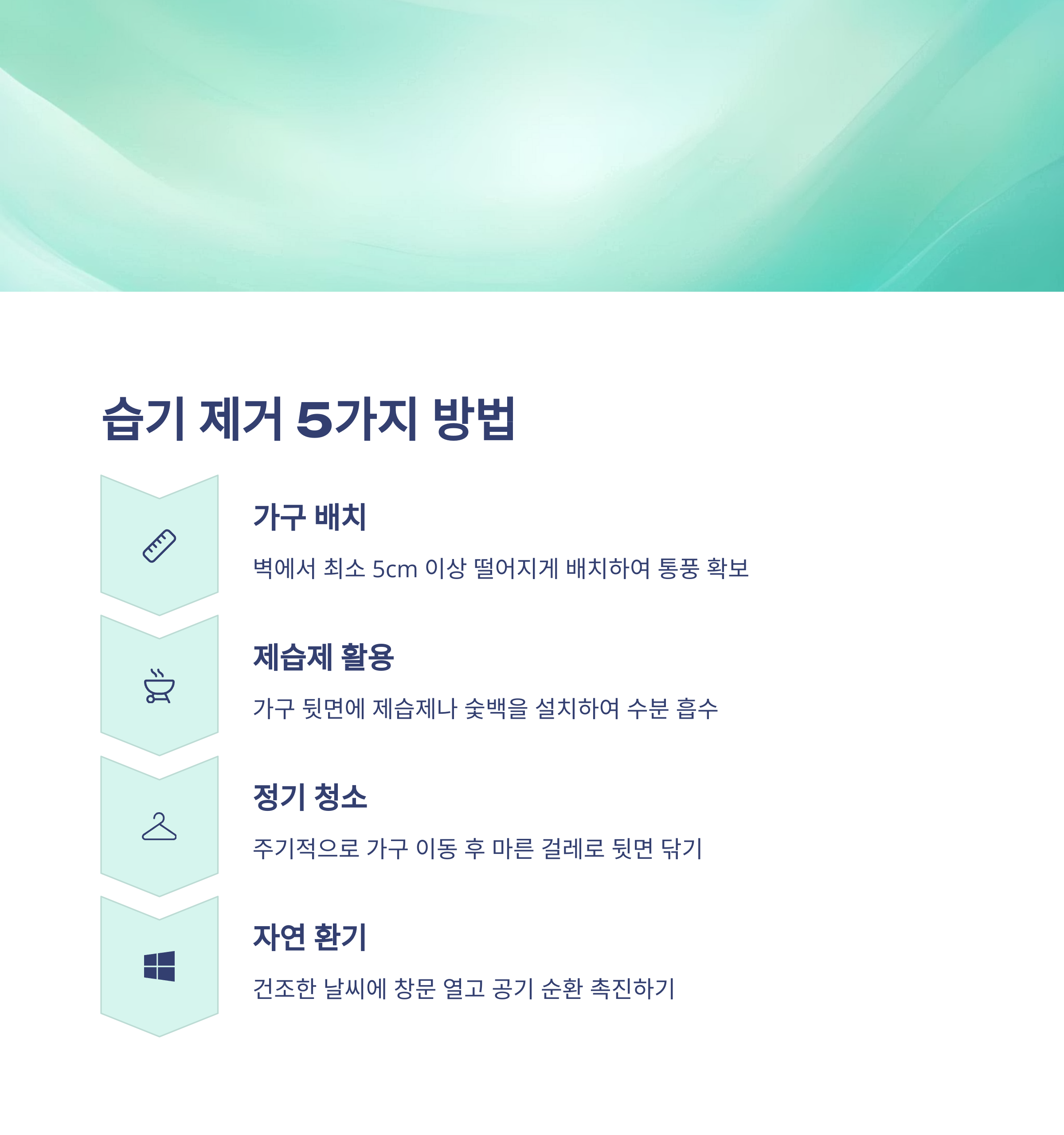 - 가구를 벽에서 5~10cm 띄워 배치해 공기 순환 확보