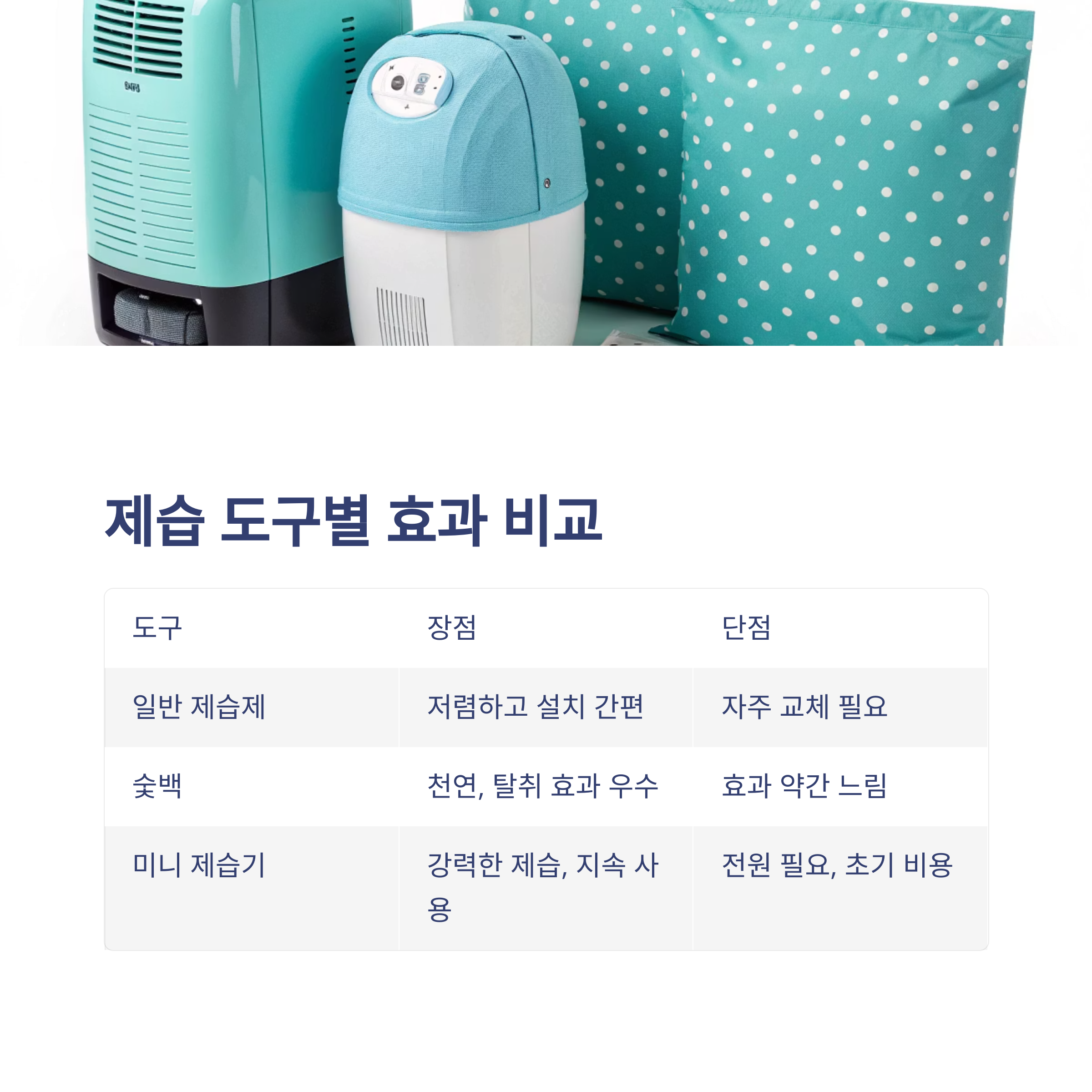 | 제습제 (일반형) | 저렴하고 설치 간편 | 자주 교체 필요 |