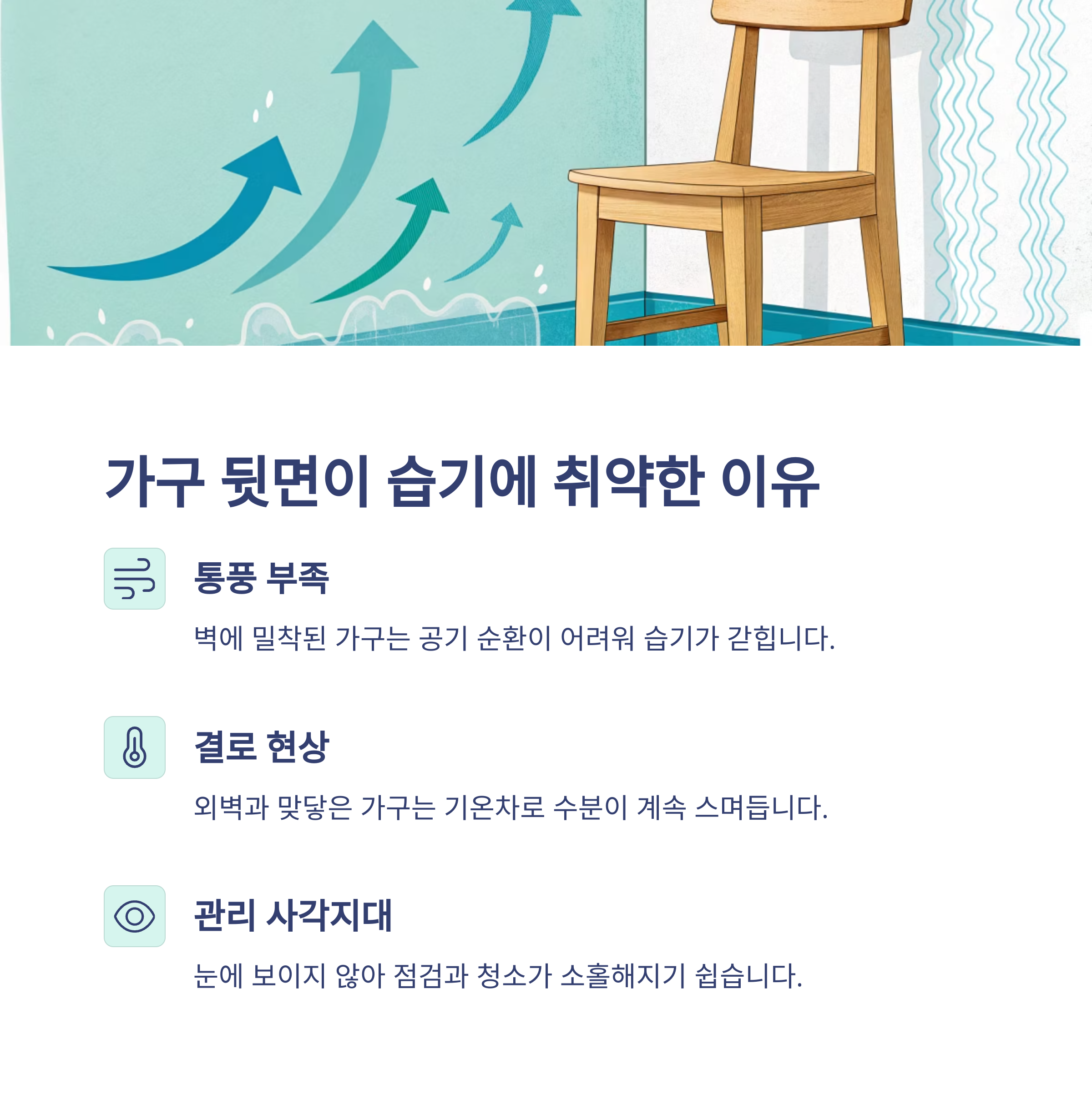 가구 뒷면은 집 안에서도 특히 통풍이 어려운 구조입니다. 벽에 밀착된 형태로 배치되는 경우가 많기 때문에 공기가 원활하게 순환되지 못하고, 그 공간에 습기가 갇히게 됩니다. 특히 외벽과 맞닿은 벽 쪽에 붙은 가구들은 외부 기온 차로 인한 결로가 쉽게 발생하고, 그 수분이 계속해서 가구 뒷면에 스며드는 구조가 됩니다. 이처럼 눈에 보이지 않는 곳에서 수분이 축적되다 보면 자연스럽게 곰팡이나 악취가 발생하게 되죠.