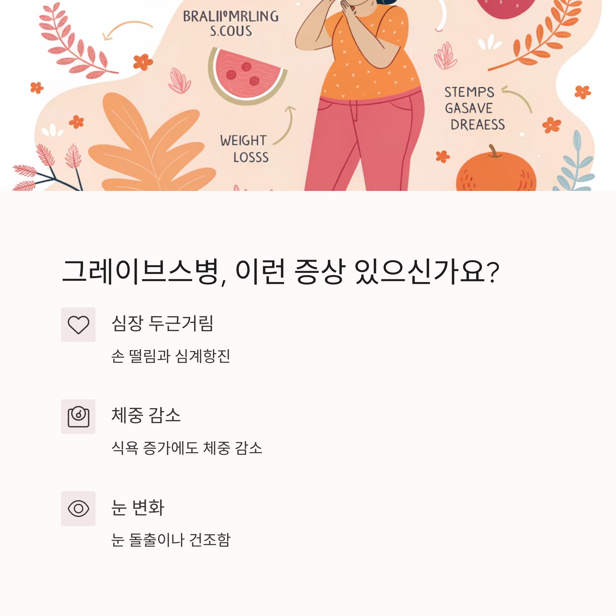 그레이브스병은 전신적인 질환이라 다양한 증상이 나타납니다. 그중 일부는 일상생활에서 쉽게 지나칠 수 있지만, 정확히 알고 있으면 조기 진단에 큰 도움이 됩니다.
