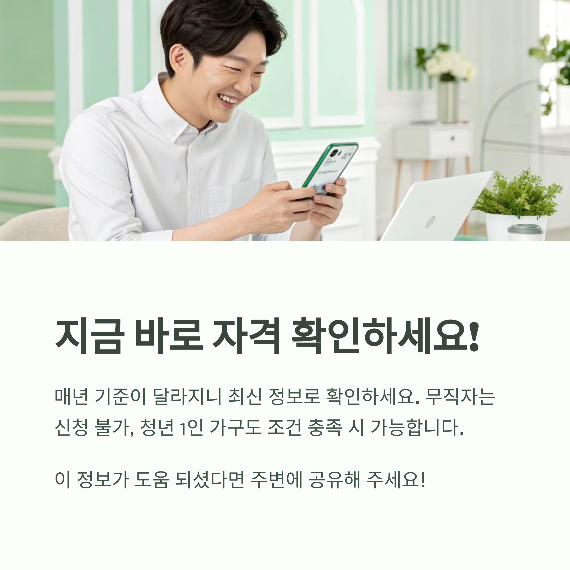 - 주택이 있는데도 신청 가능한가요? → 총재산이 2억 원 미만이라면 신청 가능합니다.