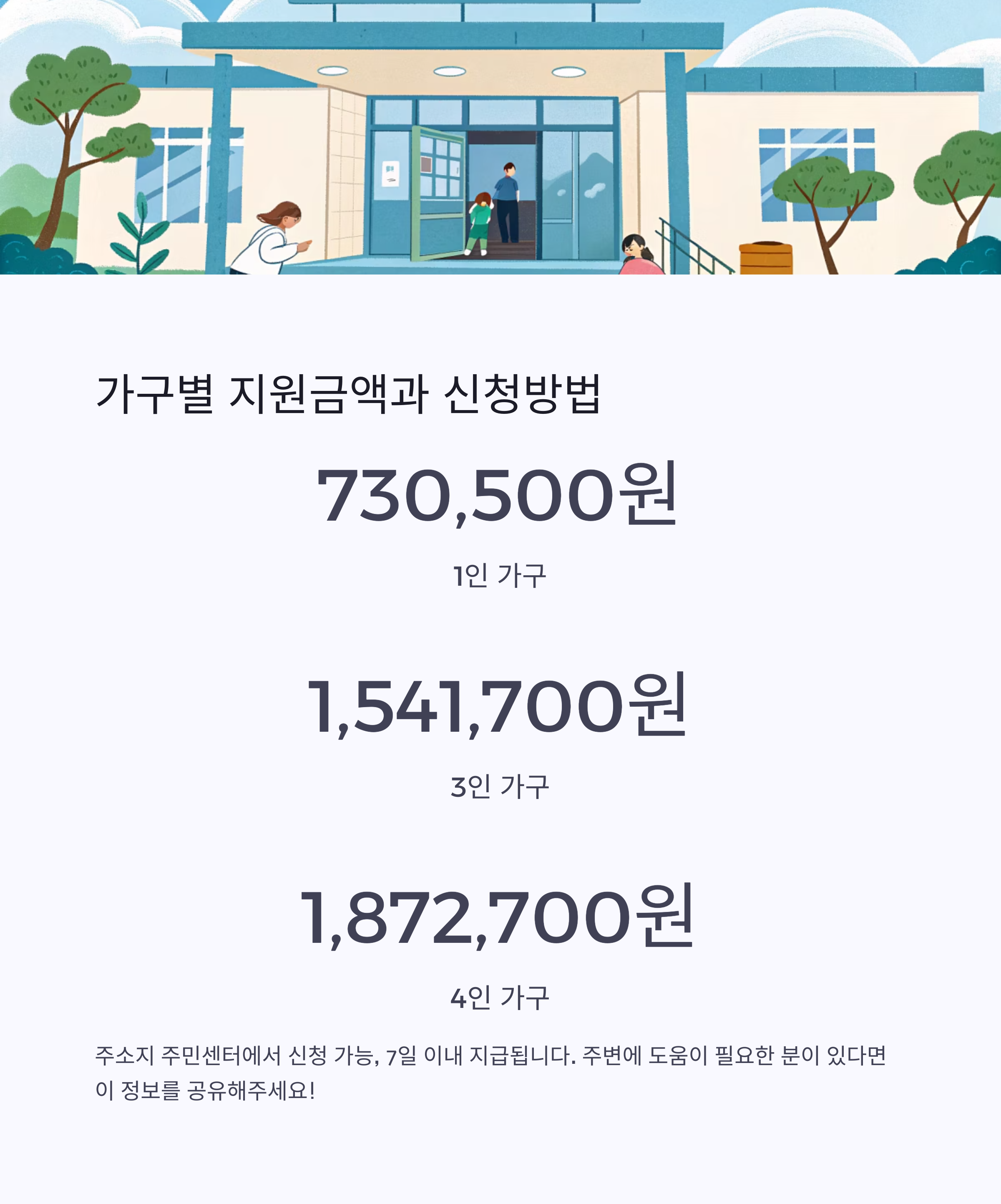 안녕하세요. 오늘은 갑작스럽게 소득이 끊기거나 위기상황에 처한 분들을 위한 '긴급복지 생계지원'에 대해 자세히 안내해 드리겠습니다. 직장 실직, 질병, 가정폭력, 화재 등 다양한 사유로 생계가 어려워졌을 때 국가가 어떤 방식으로 도와주는지, 실제 어떤 금액을 받을 수 있는지 궁금하신 분들 많으시죠? 이 글에서는 지원대상 조건부터 생계급여 금액까지 알기 쉽게 설명드릴 테니 꼭 끝까지 읽어주세요. 내가 또는 내 가족이 이 지원을 받을 수 있을지도 모릅니다.
