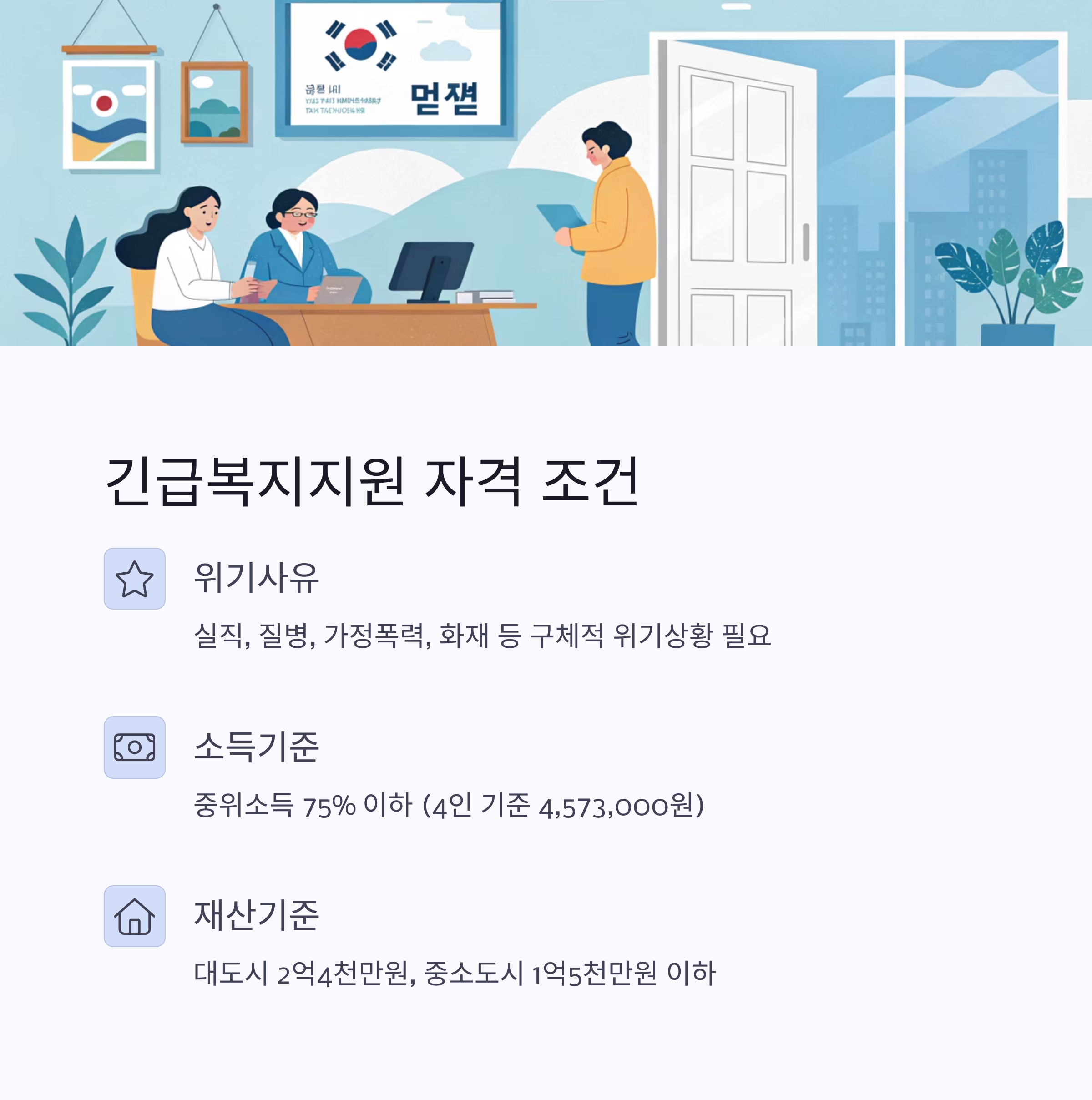 즉, 주소득자의 실직이나 사망, 중한 질병, 자연재해, 가정폭력, 노숙 등의 위기상황이 발생해 본인 또는 가족이 당장 생계가 막막해진 경우에 해당하며, 보건복지부에서 정한 세부 기준에 따라 판단됩니다. 위기 발생 후 최대한 빠르게 신청하는 것이 매우 중요합니다.