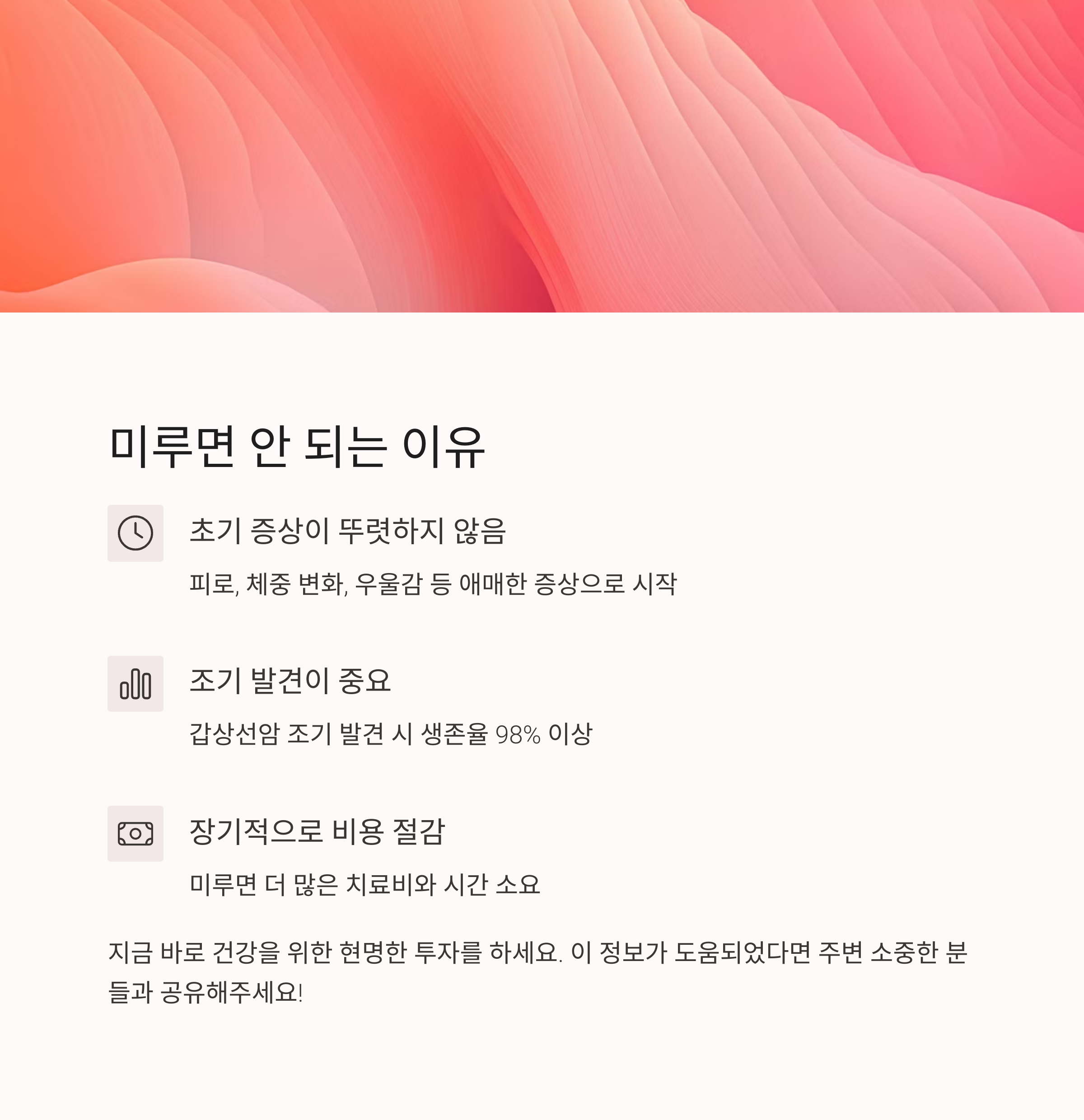 “나중에 받자”라는 말, 몸은 그 사이에도 조용히 변하고 있다는 걸 잊기 쉽습니다. 특히 갑상선 질환은 초기 증상이 뚜렷하지 않아 진단이 늦어지기 쉽고, 치료 시기를 놓치면 장기적으로 더 많은 치료비와 시간이 소요될 수 있습니다. 갑상선암이 조기 발견 시 생존율이 98%를 넘는다는 점도 미루지 말아야 할 이유입니다.