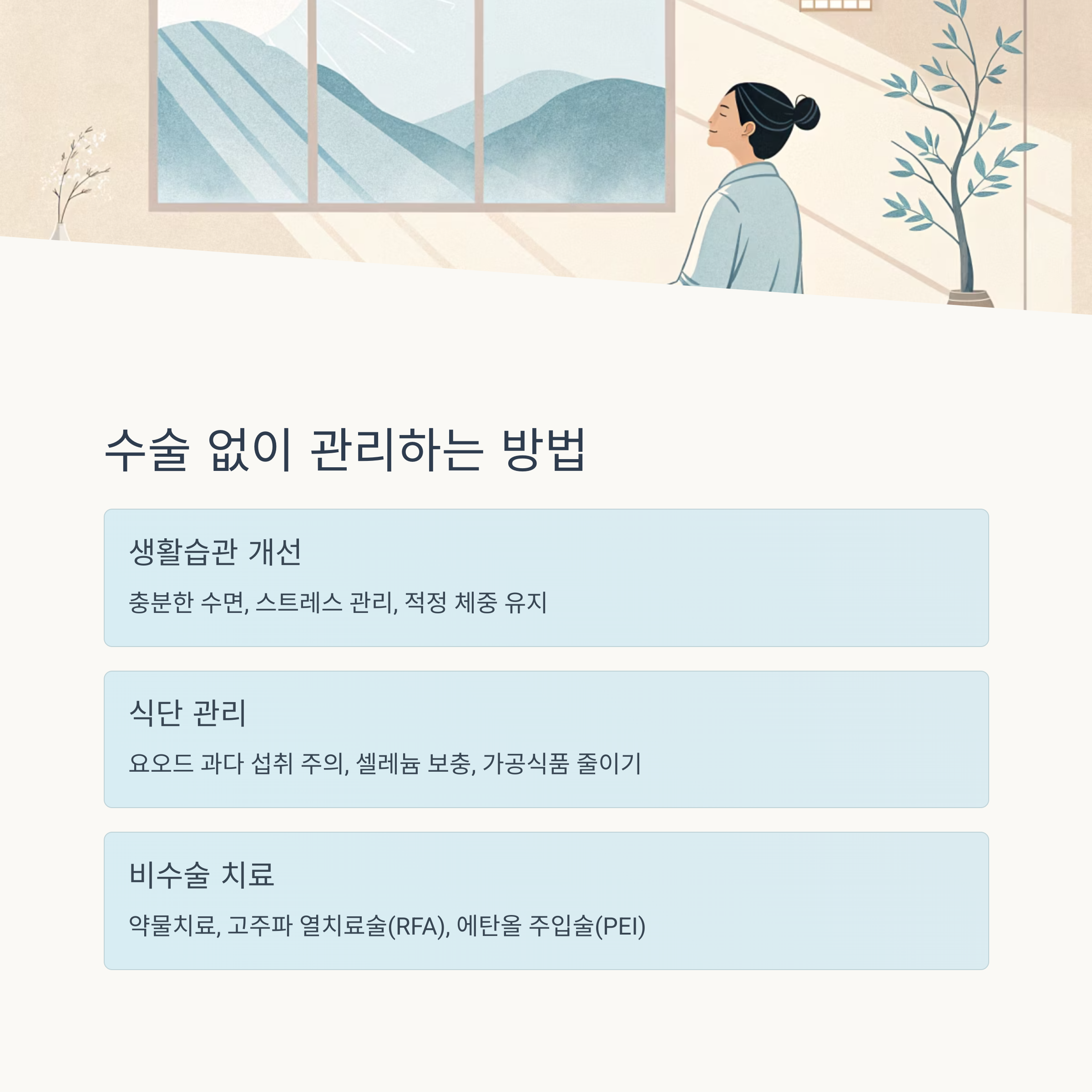 안녕하세요, 저는 건강에 진심인 블로거입니다. 저도 몇 년 전, 정기 건강검진에서 ‘갑상선 결절이 의심된다’는 말을 들었을 때 정말 당황했어요. ‘이제 나도 수술을 해야 하나?’라는 생각부터 들었지만, 곧 차근차근 정보를 모으고, 전문가 상담도 받으며 ‘수술 없이도 가능한 관리법’들을 하나씩 실천해봤습니다. 그 경험을 바탕으로, 오늘은 갑상선 질환을 수술 없이도 관리할 수 있는 가능성에 대해 함께 나눠보려고 해요. 너무 걱정하지 마세요. 방법은 생각보다 많고, 우리 몸은 생각보다 똑똑하답니다.