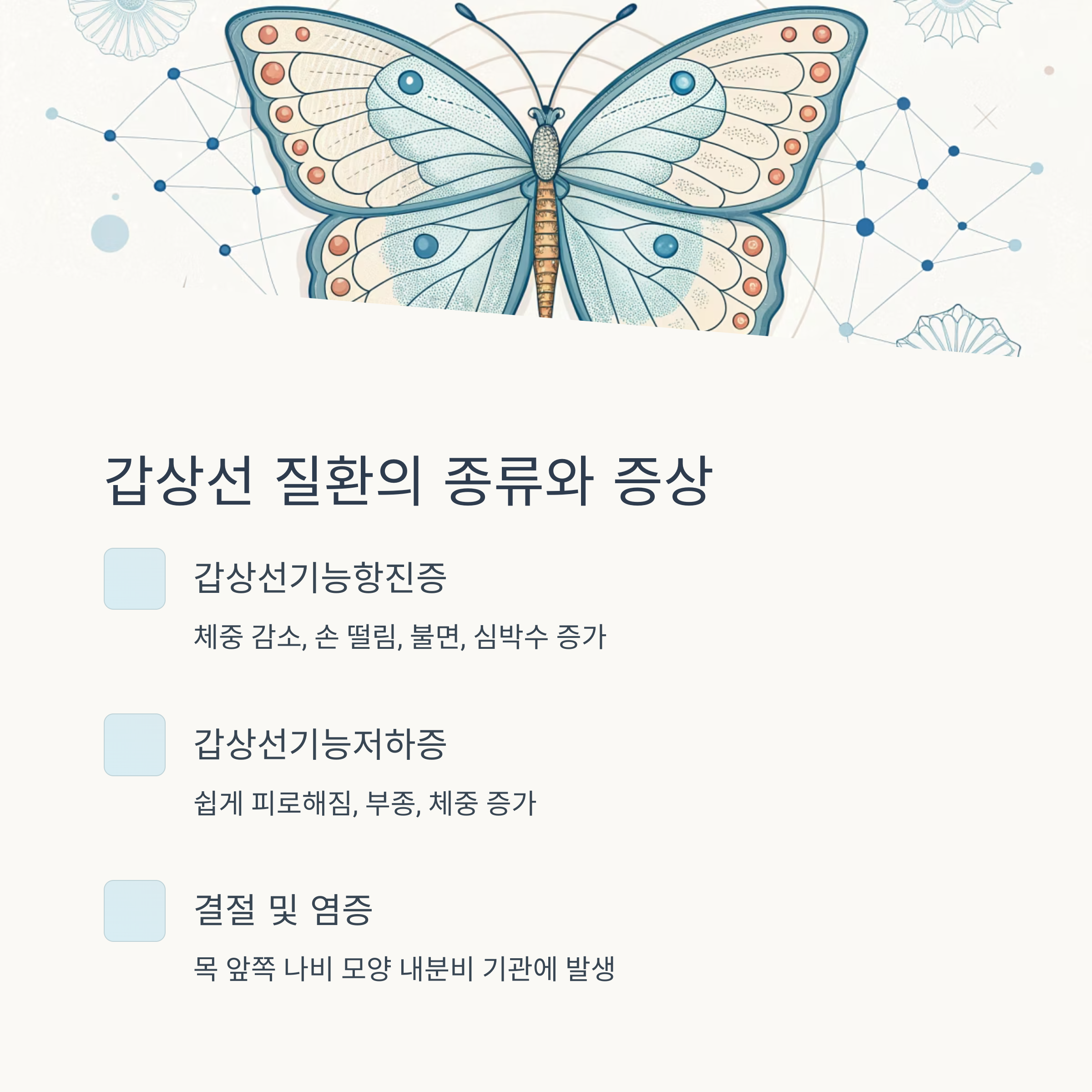 갑상선은 목 앞쪽에 위치한 나비 모양의 내분비 기관으로, 우리 몸의 신진대사 속도를 조절하는 중요한 역할을 합니다. 그런데 이 갑상선에 문제가 생기면 생각보다 다양한 증상이 나타날 수 있어요. 대표적인 질환은 갑상선기능항진증, 갑상선기능저하증, 결절, 염증 등이 있습니다. 각 질환마다 증상도 조금씩 다릅니다.