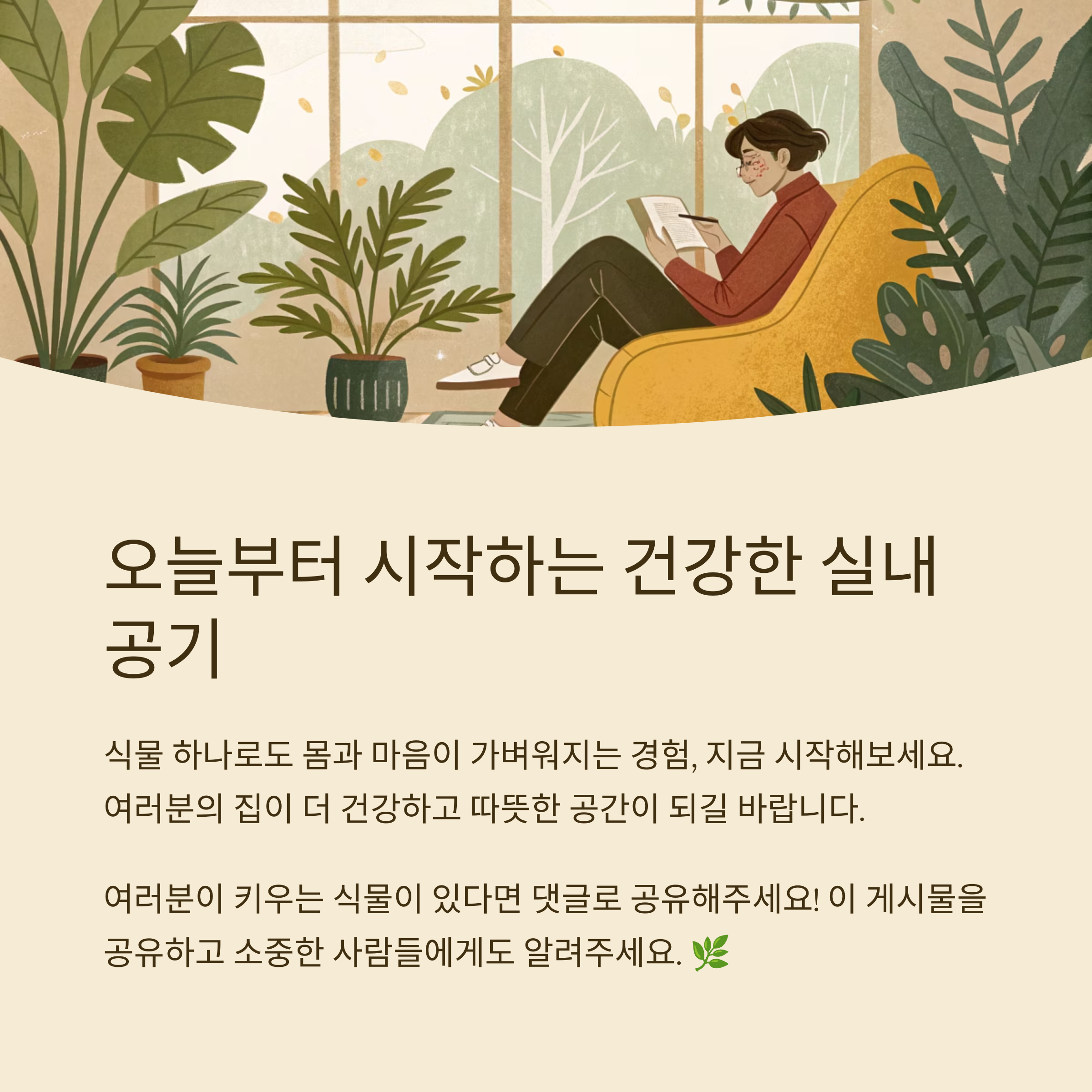 지금까지 소개한 공기정화식물 5가지, 여러분도 하나쯤은 들어보셨을 거예요. 실내 공기질이 좋아지면 몸도 마음도 훨씬 가벼워진답니다. 복잡한 세상 속에서 자연과 조금 더 가까워지는 방법, 식물 하나로도 충분할 수 있어요. 오늘 당장 가까운 화원이나 마트에 들러 내 공간에 맞는 반려식물을 한 번 데려와 보세요. 생각보다 훨씬 큰 위안을 받을 수 있을 거예요. 여러분의 집이 한층 더 건강하고 따뜻한 공간이 되기를 바라며, 댓글로 여러분이 키우는 식물도 공유해 주세요!