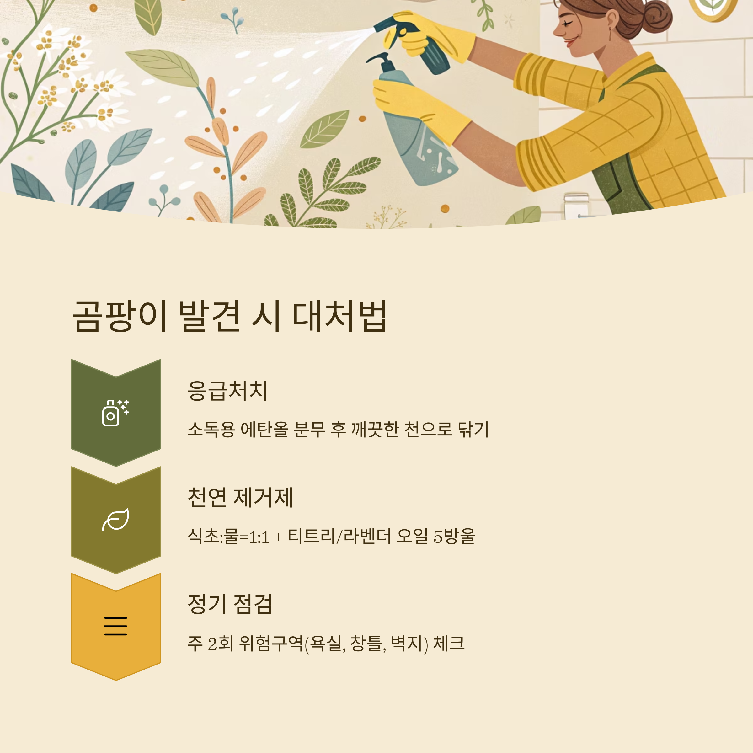 곰팡이는 발견 즉시 처리하지 않으면 퍼지기 시작합니다. 초기에는 표면에만 얕게 퍼져 있지만 시간이 지날수록 벽지 안쪽이나 나무 소재 내부까지 침투하게 되죠. 발견 즉시 소독용 에탄올을 분무기에 담아 곰팡이 위에 충분히 분사한 후, 깨끗한 천으로 닦아내고 건조하는 것이 가장 안전하고 효과적인 응급처치입니다.