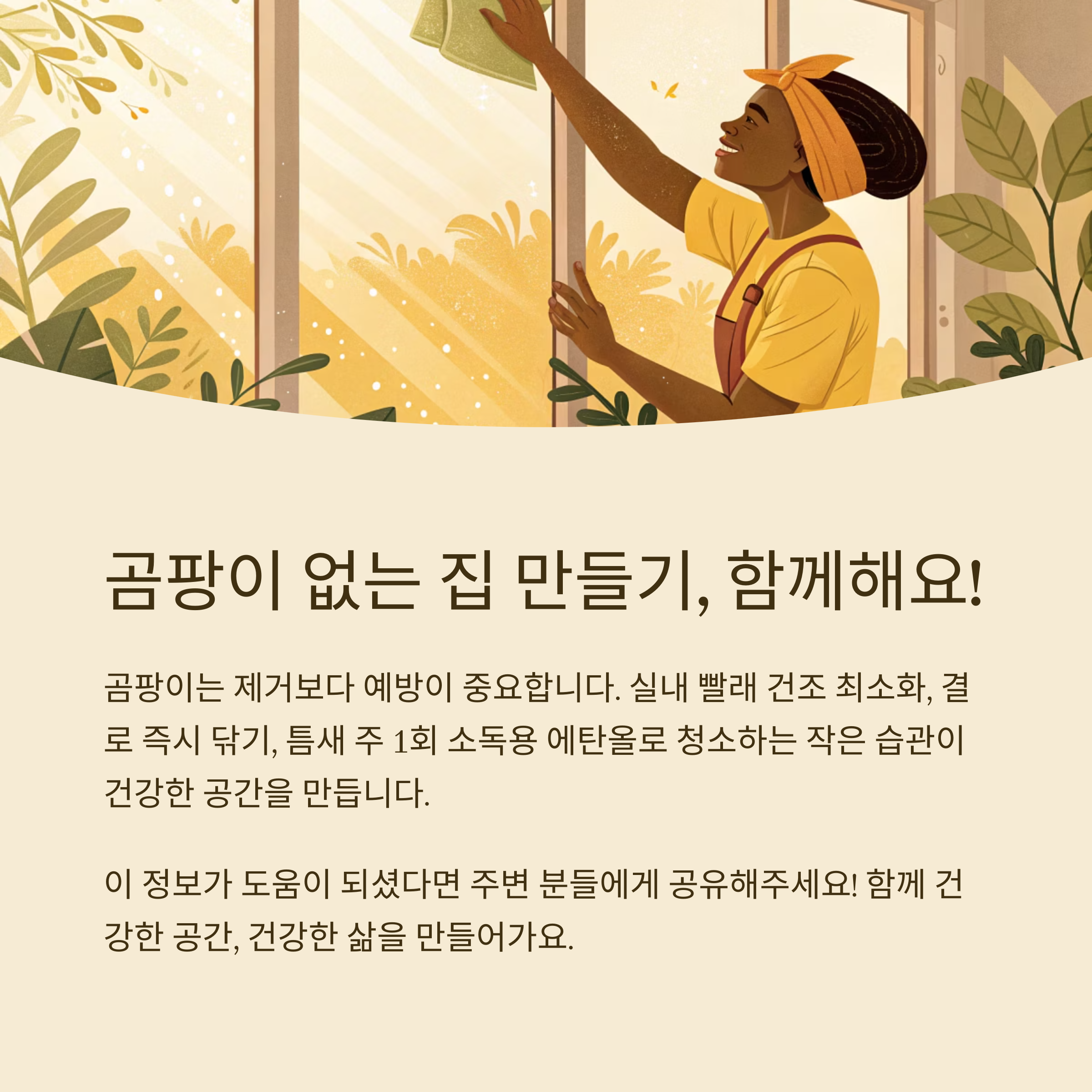 곰팡이는 한번 생기면 제거보다 예방이 훨씬 더 중요합니다. 특히 장마철에는 우리가 잠깐 방심한 사이, 실내 습도와 정체된 공기로 인해 순식간에 퍼질 수 있죠. 오늘 소개한 5단계 전략은 실천만 잘해도 곰팡이 없는 쾌적한 공간을 유지하는 데 큰 도움이 될 거예요. 그리고 무엇보다 중요한 건 '습기 감지에 민감해지는 습관'입니다. 작지만 꾸준한 관리가 결국 우리 집을 지키는 가장 강력한 무기가 되어줄 거예요. 앞으로도 건강한 공간, 건강한 삶을 위해 함께 해요!