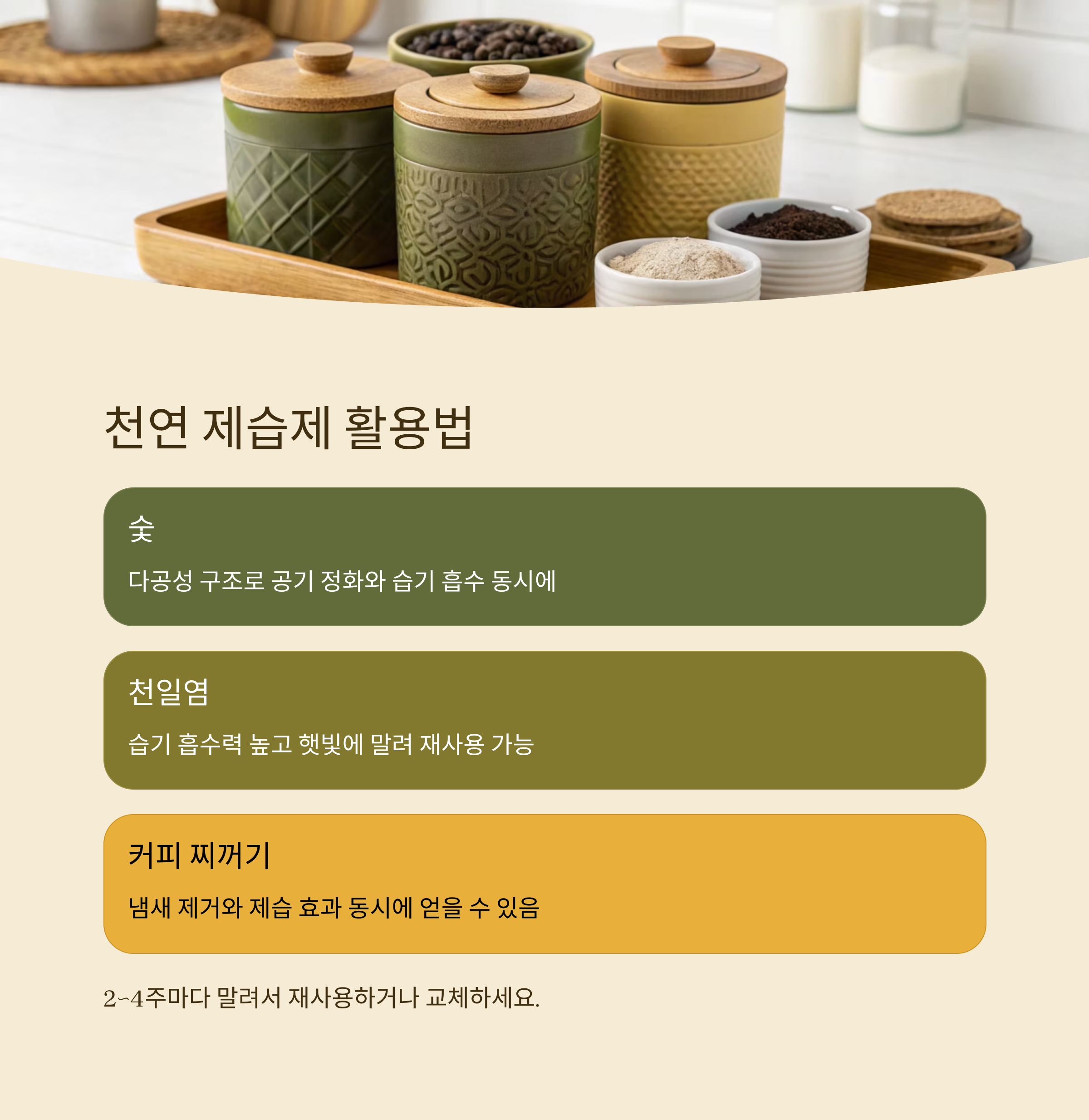시중의 화학 제습제도 좋지만, 천연 재료로도 충분히 습기를 흡수할 수 있습니다. 특히 아이가 있는 집이나 반려동물과 함께 사는 가정에서는 천연 제습제를 추천드립니다. 다음은 가장 많이 사용하는 천연 제습제 3가지입니다.
