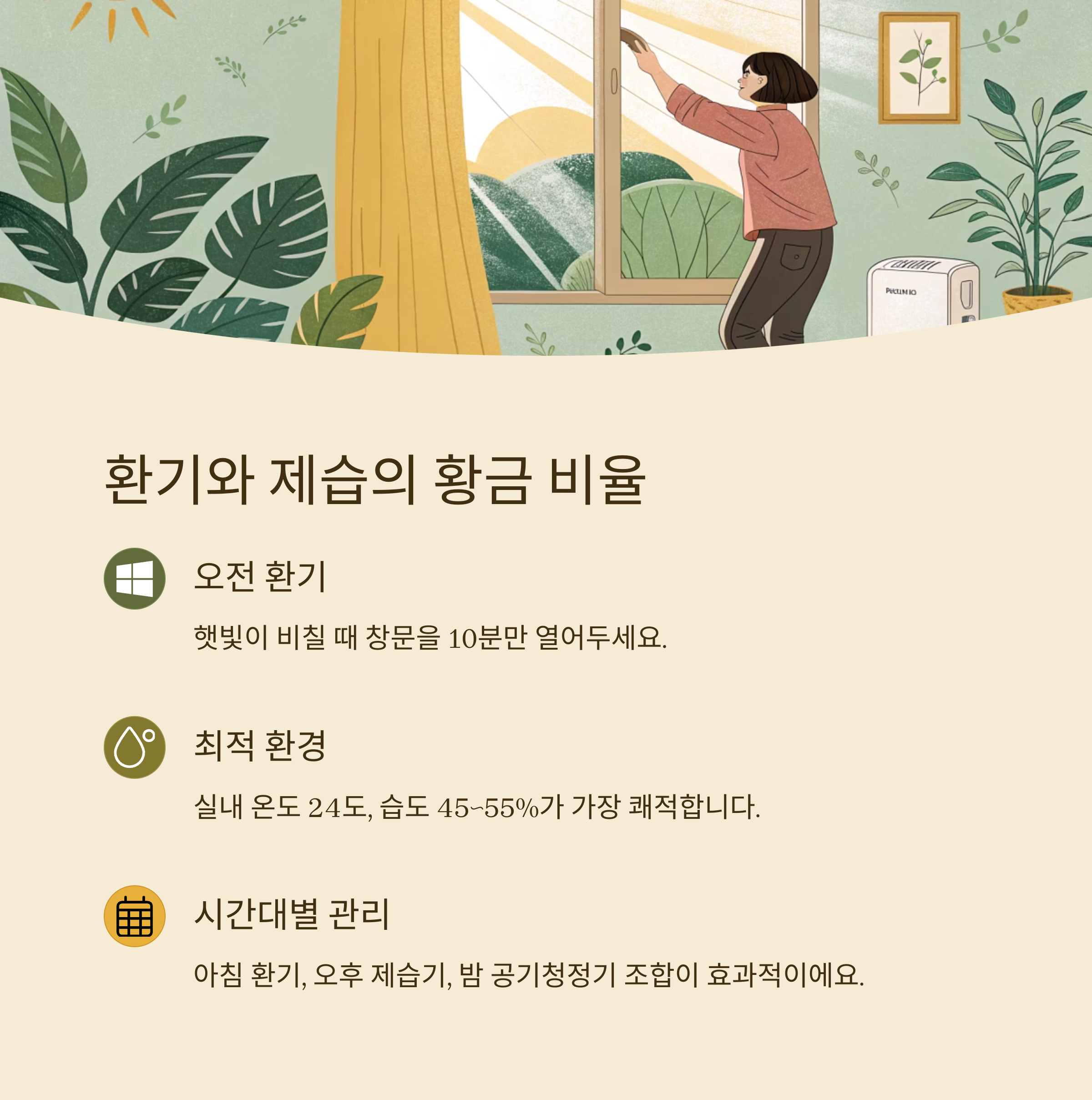 비가 그친 틈을 이용해 하루에 1~2회, 약 10분 정도 환기하는 것이 좋습니다. 오전 햇살이 들 때가 가장 효과적이에요.
