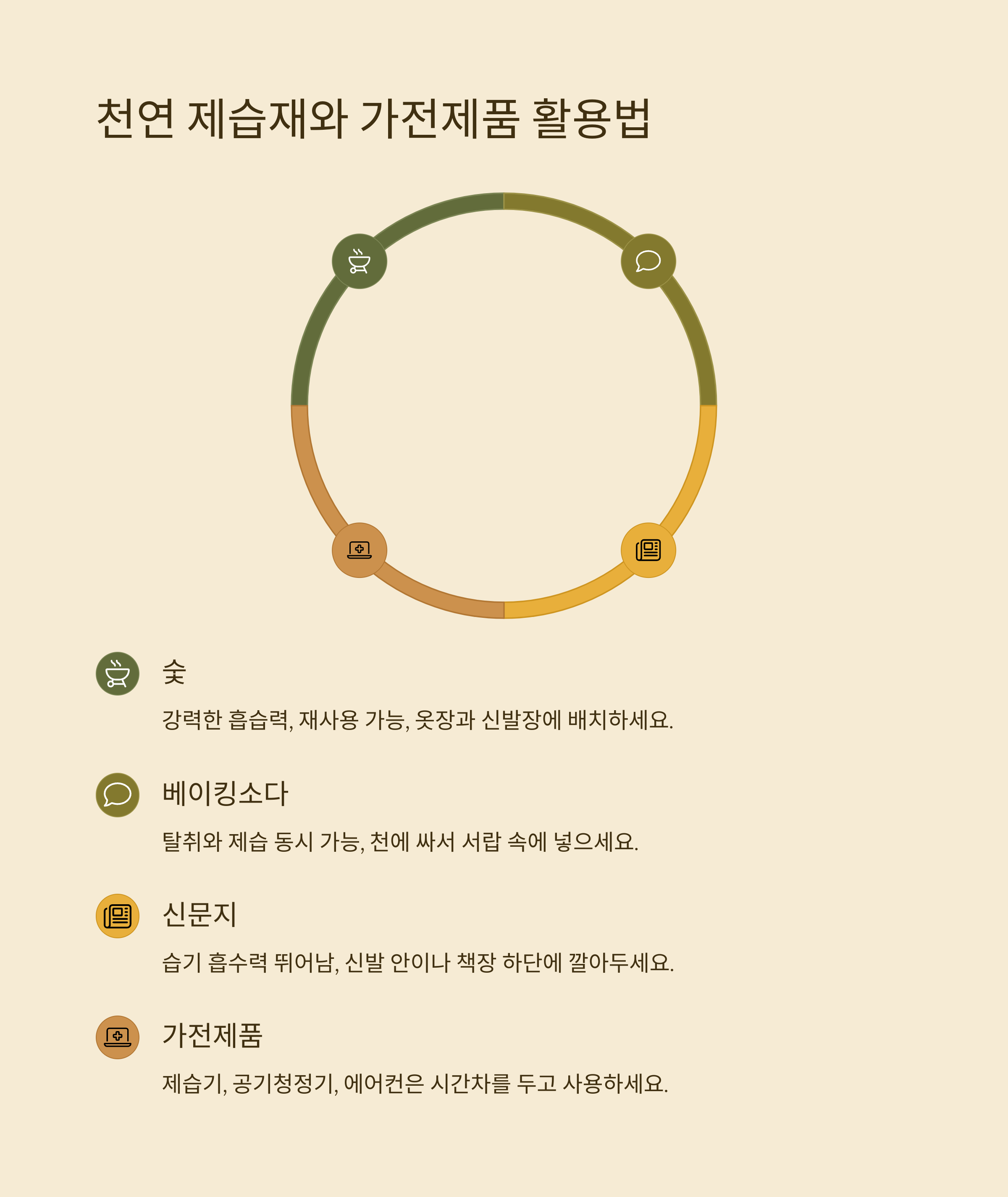| 신문지 | 습기 흡수력 뛰어남 | 신발 안, 책장 하단에 깔아두기 |