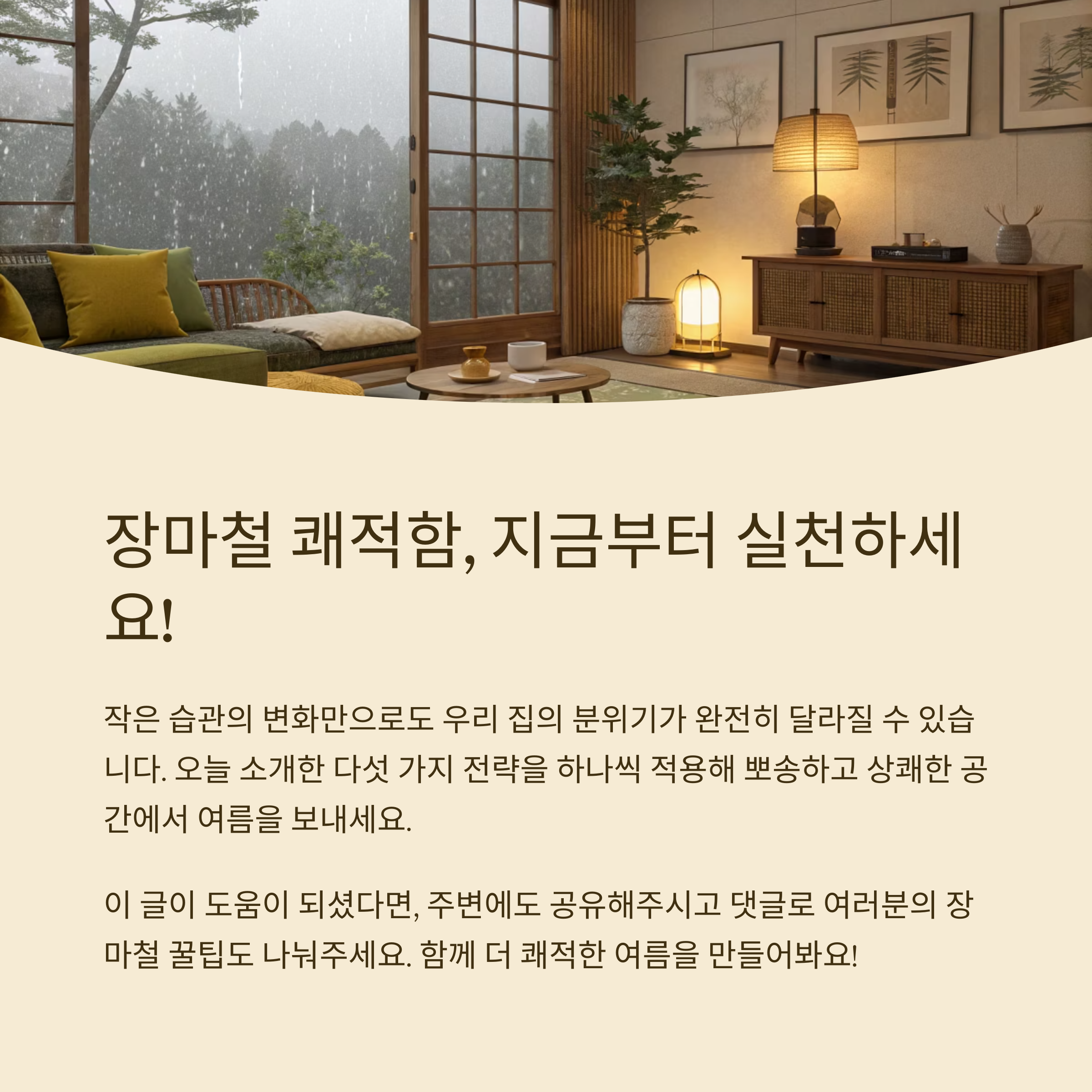 장마철은 누구에게나 피곤하고 지치는 계절일 수 있지만, 실내 환경만큼은 우리가 주도적으로 쾌적하게 바꿀 수 있어요. 오늘 소개한 다섯 가지 실천 전략을 하나씩 적용해보세요. 작은 습관의 변화만으로도 우리 집의 분위기가 완전히 달라질 수 있습니다. 여러분도 저처럼 뽀송하고 상쾌한 공간에서 여름을 보낼 수 있기를 바랄게요. 실내 쾌적함, 지금부터 하나씩 실천해보세요!
