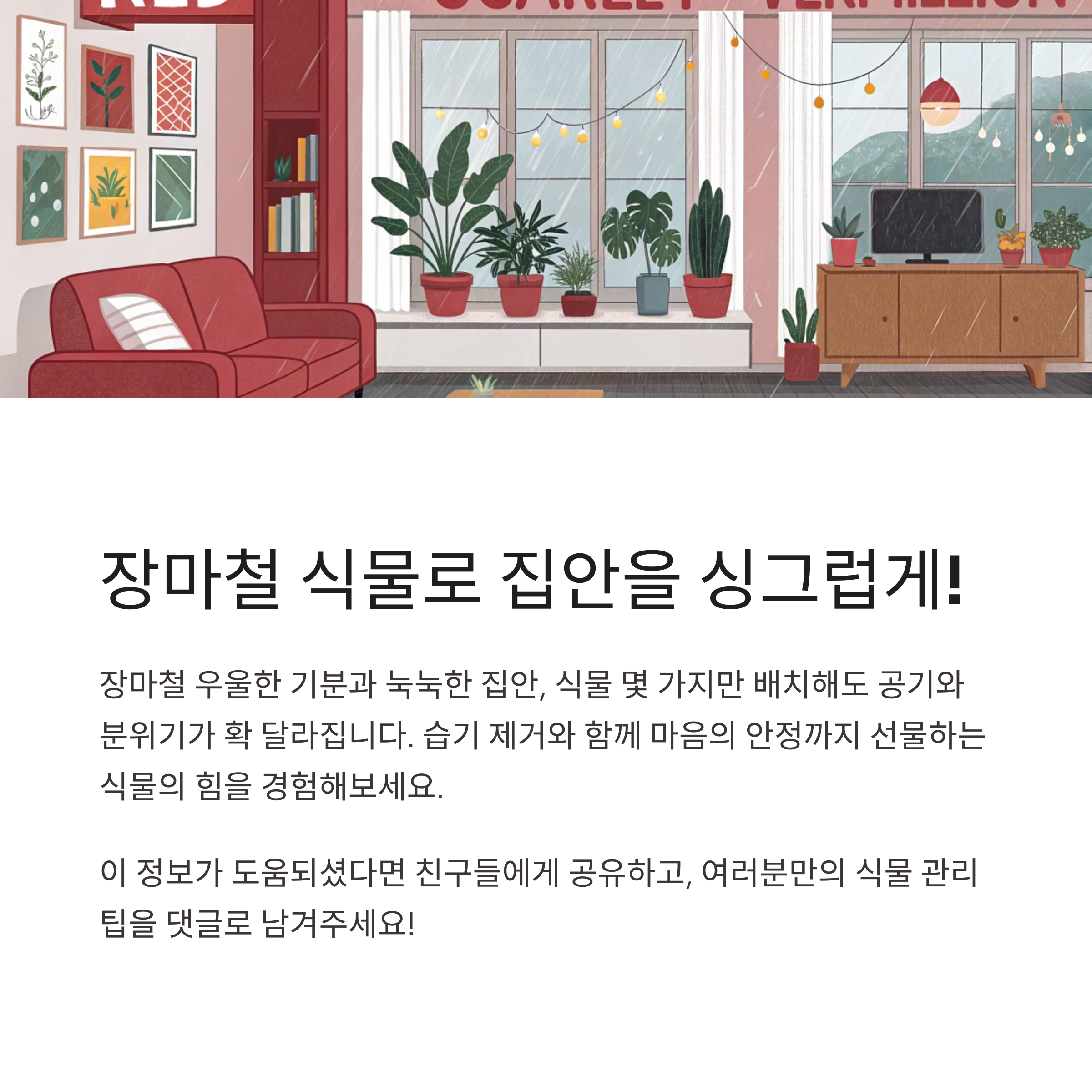 장마철이 찾아오면 괜히 기분도 축축 처지고, 집안 분위기도 무거워지죠. 하지만 오늘 소개한 식물 몇 가지만 집안 곳곳에 배치해도 공기와 분위기가 확 달라질 수 있어요. 습기 제거뿐 아니라 마음의 안정감까지 주는 식물의 힘, 이번 장마철엔 꼭 한 번 경험해 보시길 바라요. 여러분의 집이 보다 쾌적하고 싱그러운 공간이 되길 응원할게요. 다음 글에서는 '햇빛 없는 환경에서도 잘 자라는 식물 추천'으로 찾아올게요. 궁금한 점은 언제든 댓글로 남겨주세요 :)