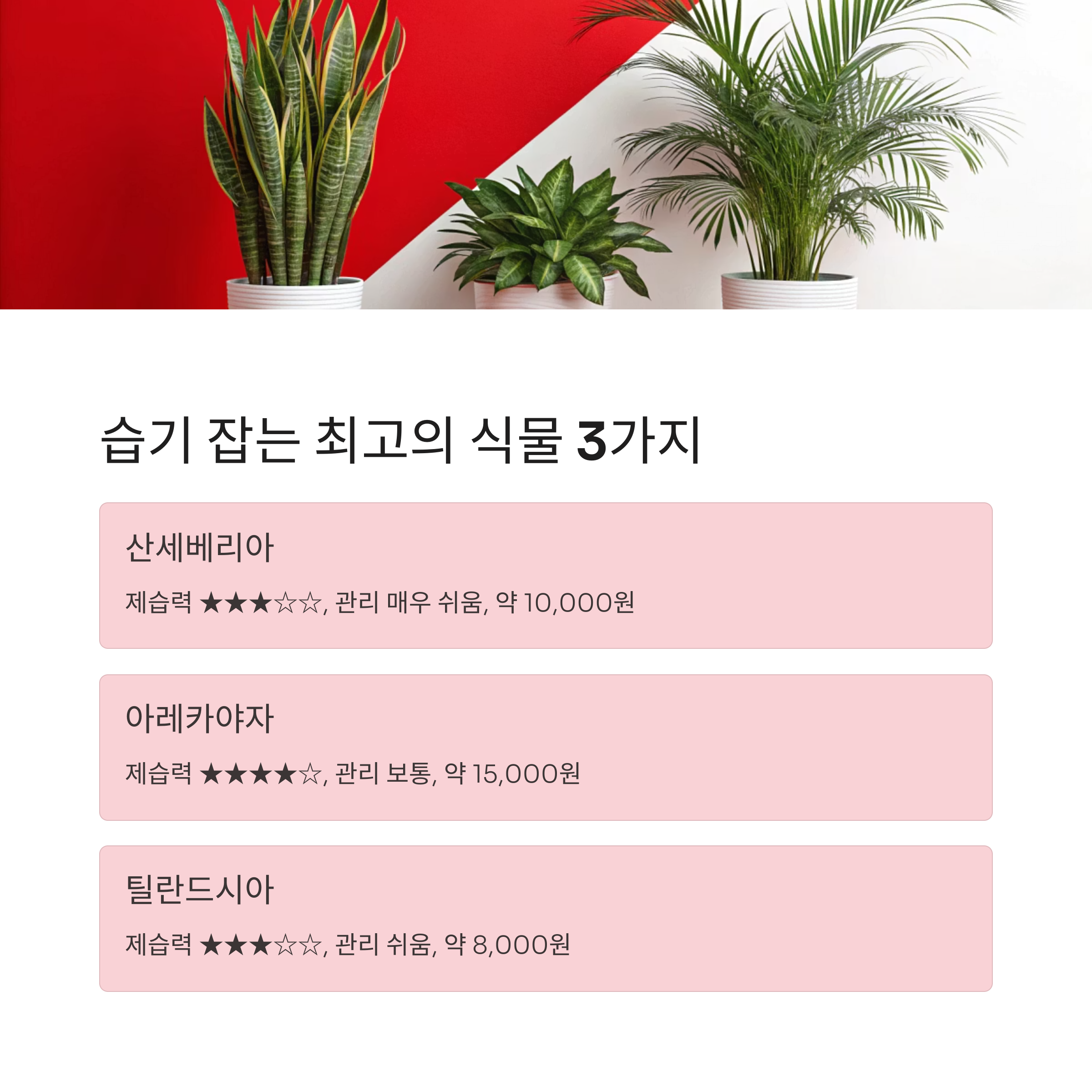 | 식물명 | 제습력 | 관리 난이도 | 평균 가격 |