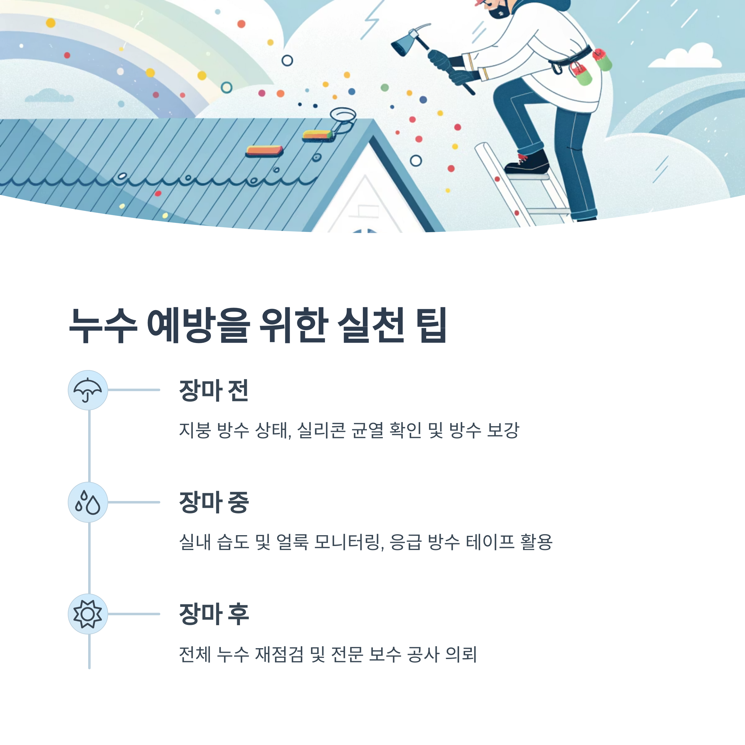 | 장마 전 | 지붕 방수 상태, 실리콘 균열 확인 | 방수 보강 시공 |