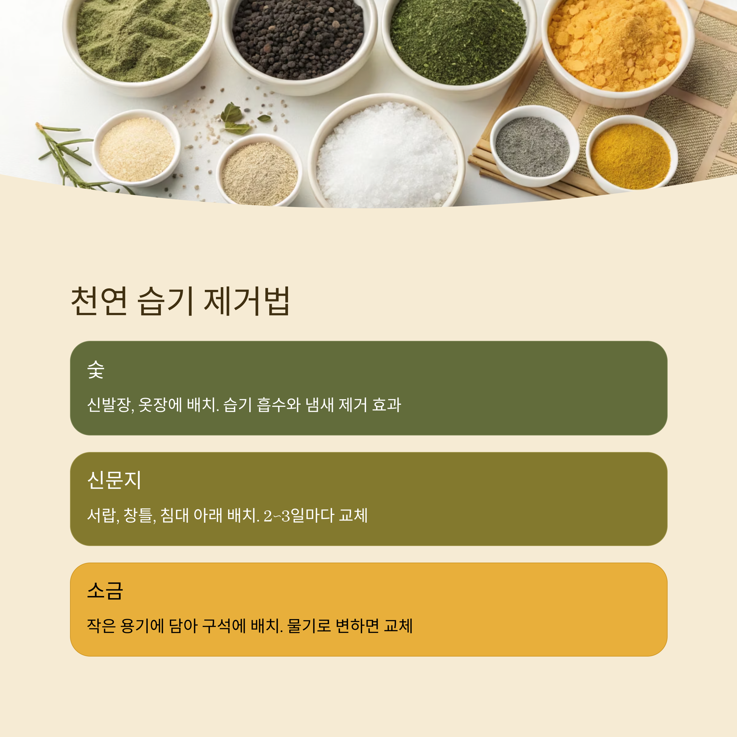 숯, 신문지, 소금 등이 있으며, 특히 숯은 탈취 효과도 있어 옷장에 좋습니다.
