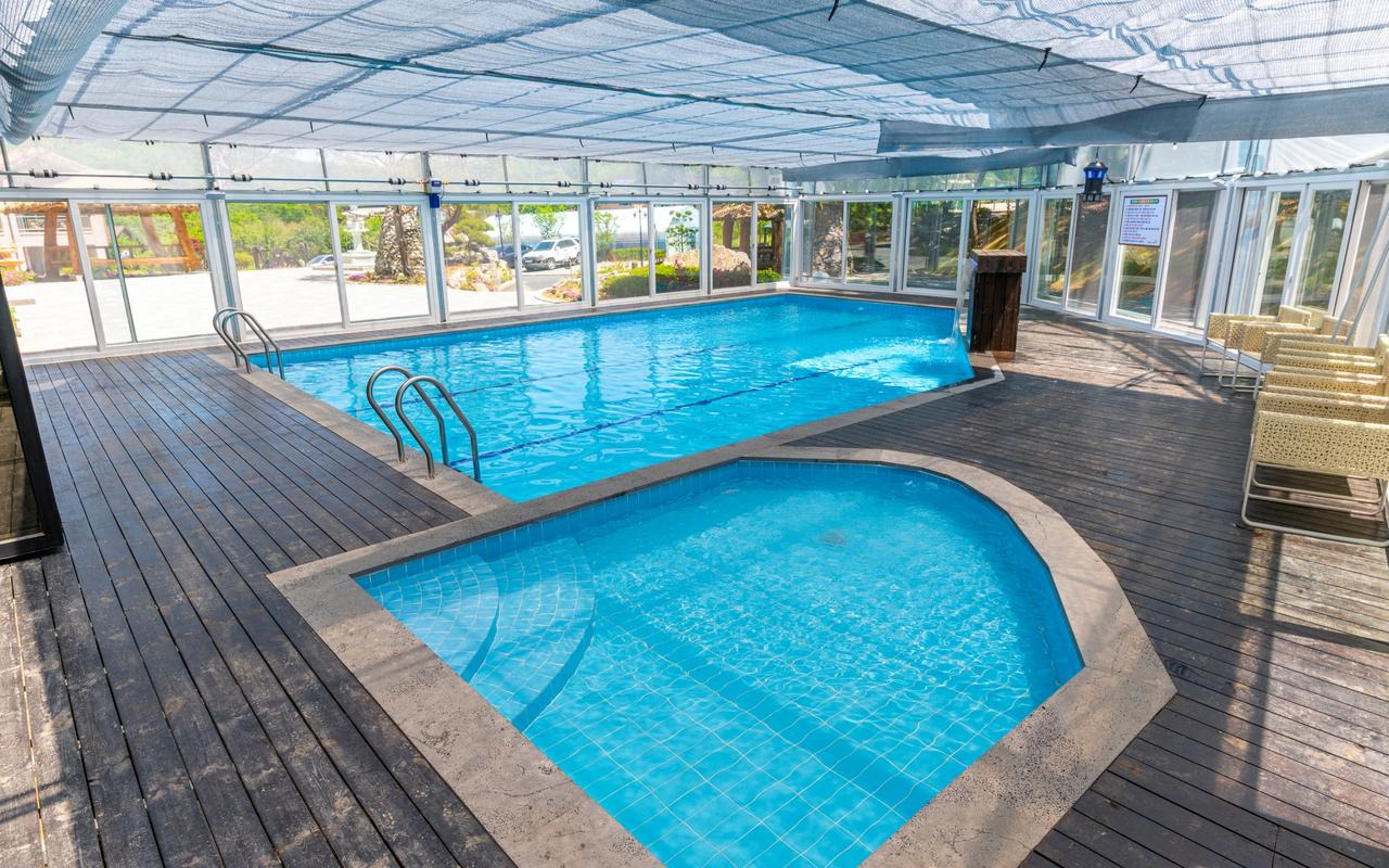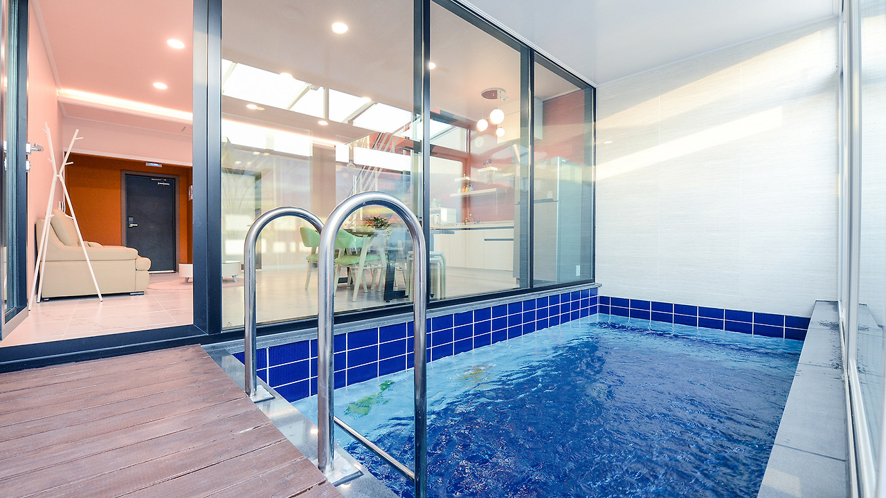 8m×3m 대형 온수 수영장에 미온수(31도)가 무료로 제공되며, 실내 수영장이지만 커다란 통창으로 답답하지 않은 구조입니다.