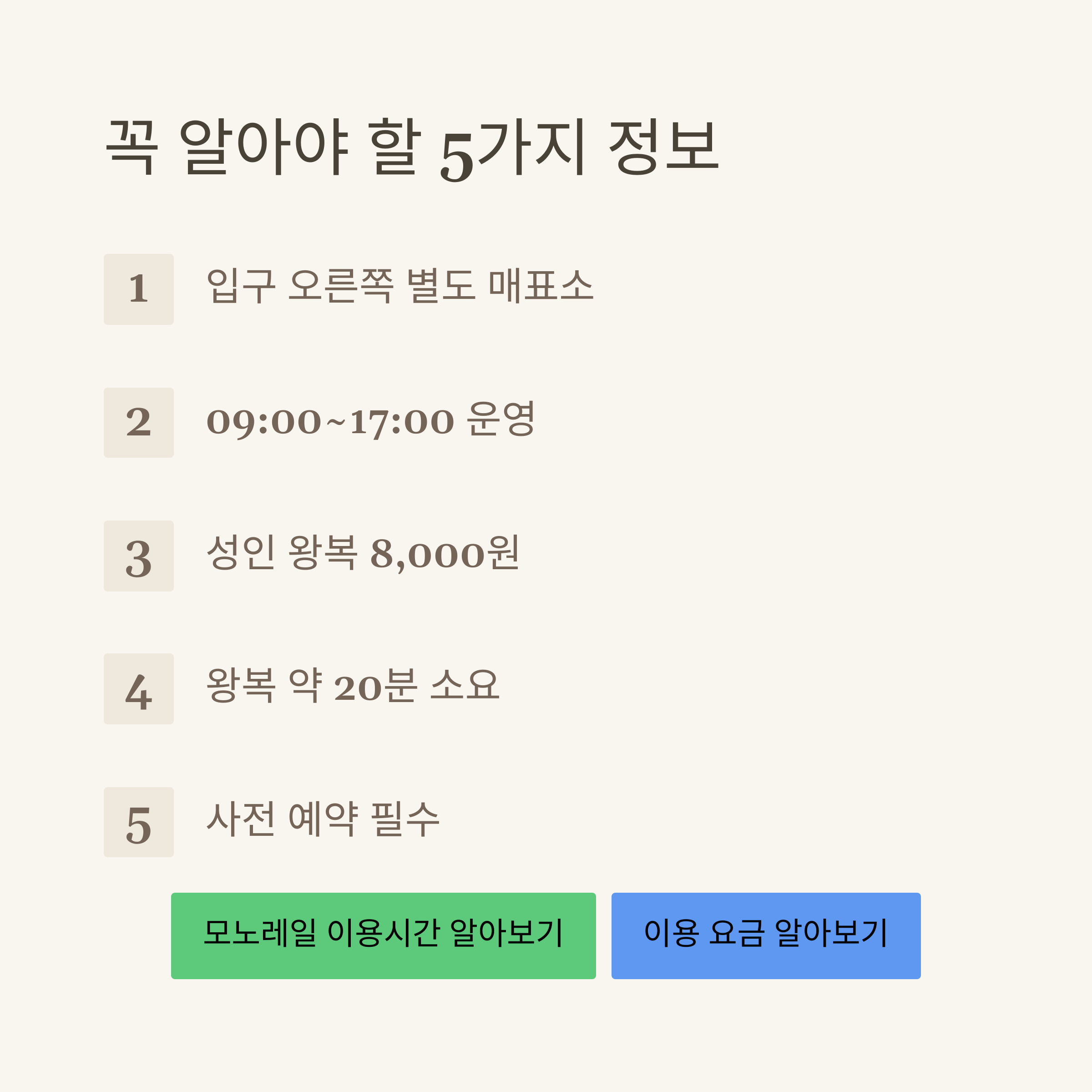 가족 단위 방문 시 알아두면 좋은 화담숲 모노레일의 5가지 핵심 정보를 정리하면 아래와 같습니다.