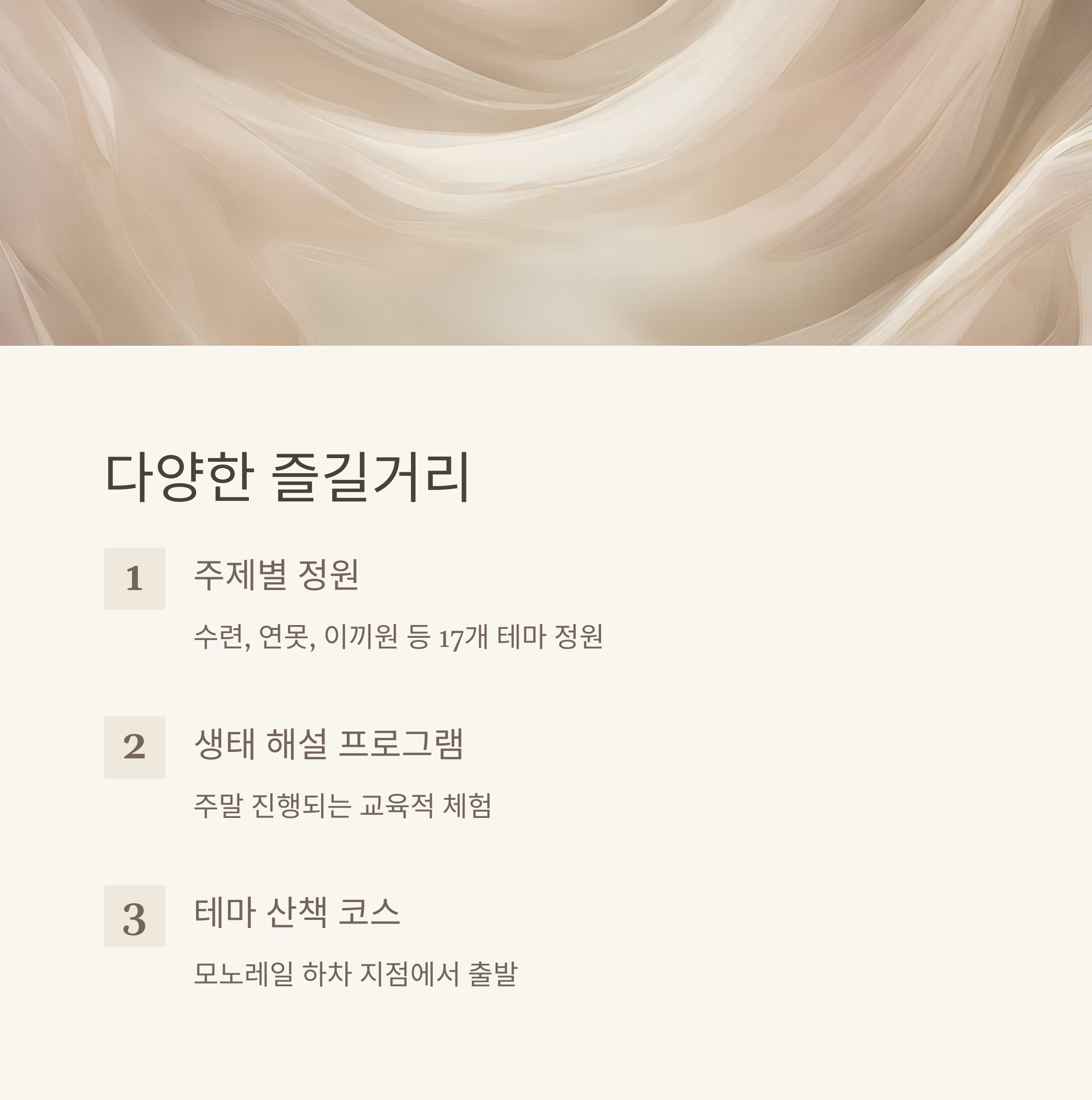 화담숲은 단순히 자연을 보는 공간이 아니라 다양한 교육적, 체험적 요소가 포함되어 있어 아이들의 자연 학습에도 도움이 됩니다. 수련, 연못, 이끼원 등 주제별 정원이 잘 조성되어 있어, 사진 촬영 장소로도 인기가 많습니다. 또한 주말엔 다양한 생태 해설 프로그램이 진행되며, 모노레일 하차 지점에서 출발하는 테마 산책 코스를 따라 걷다 보면 자연 속에서 가족 모두가 힐링을 경험할 수 있습니다.