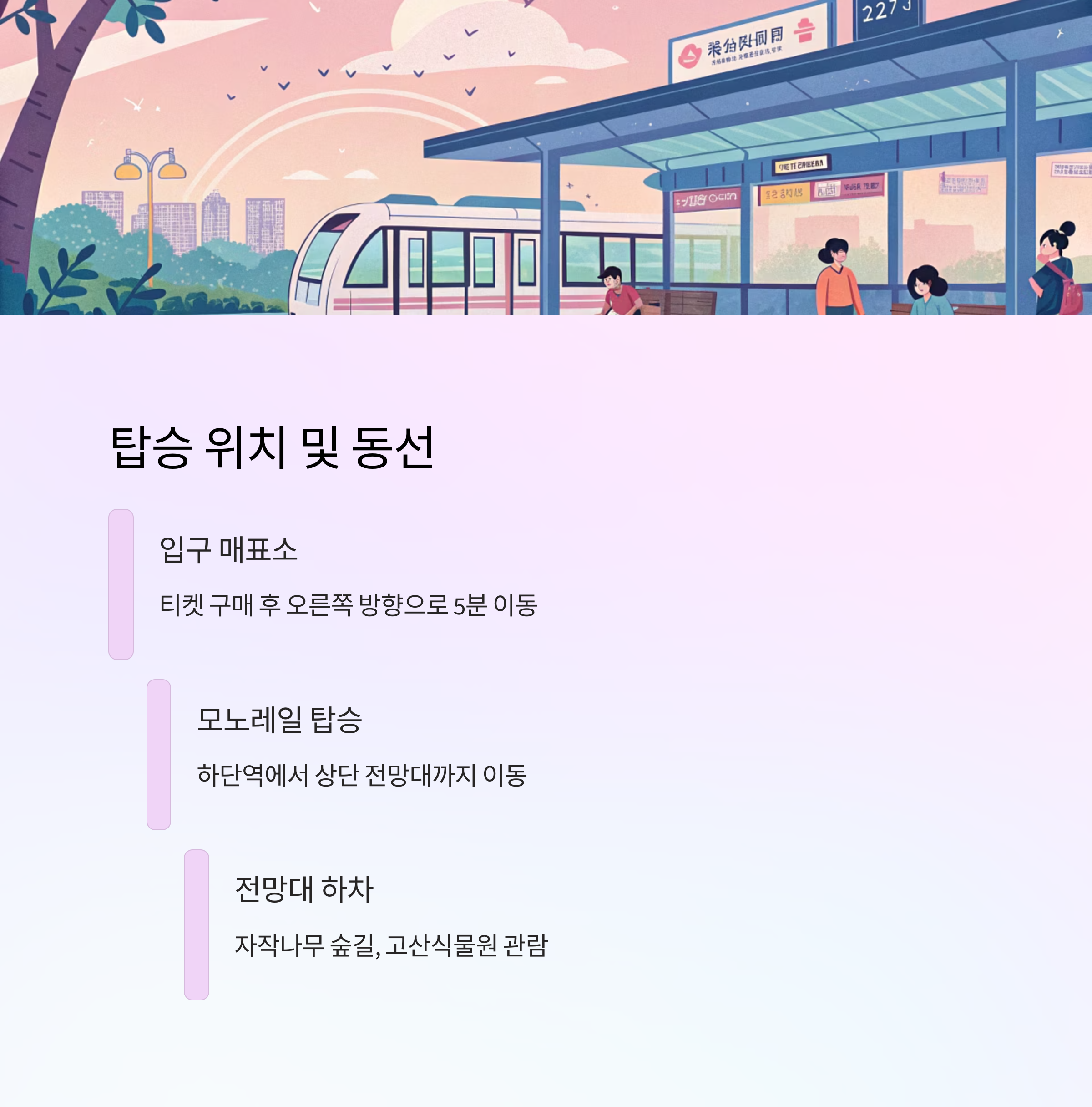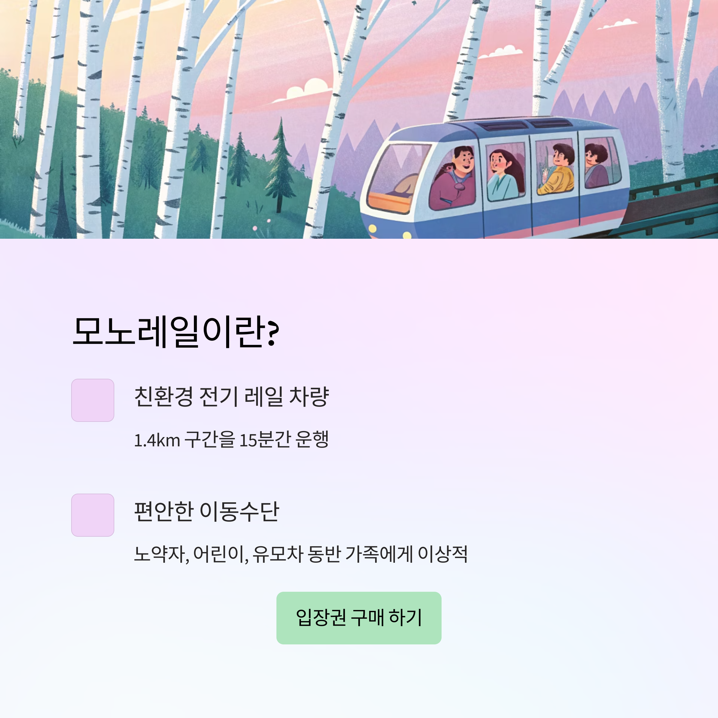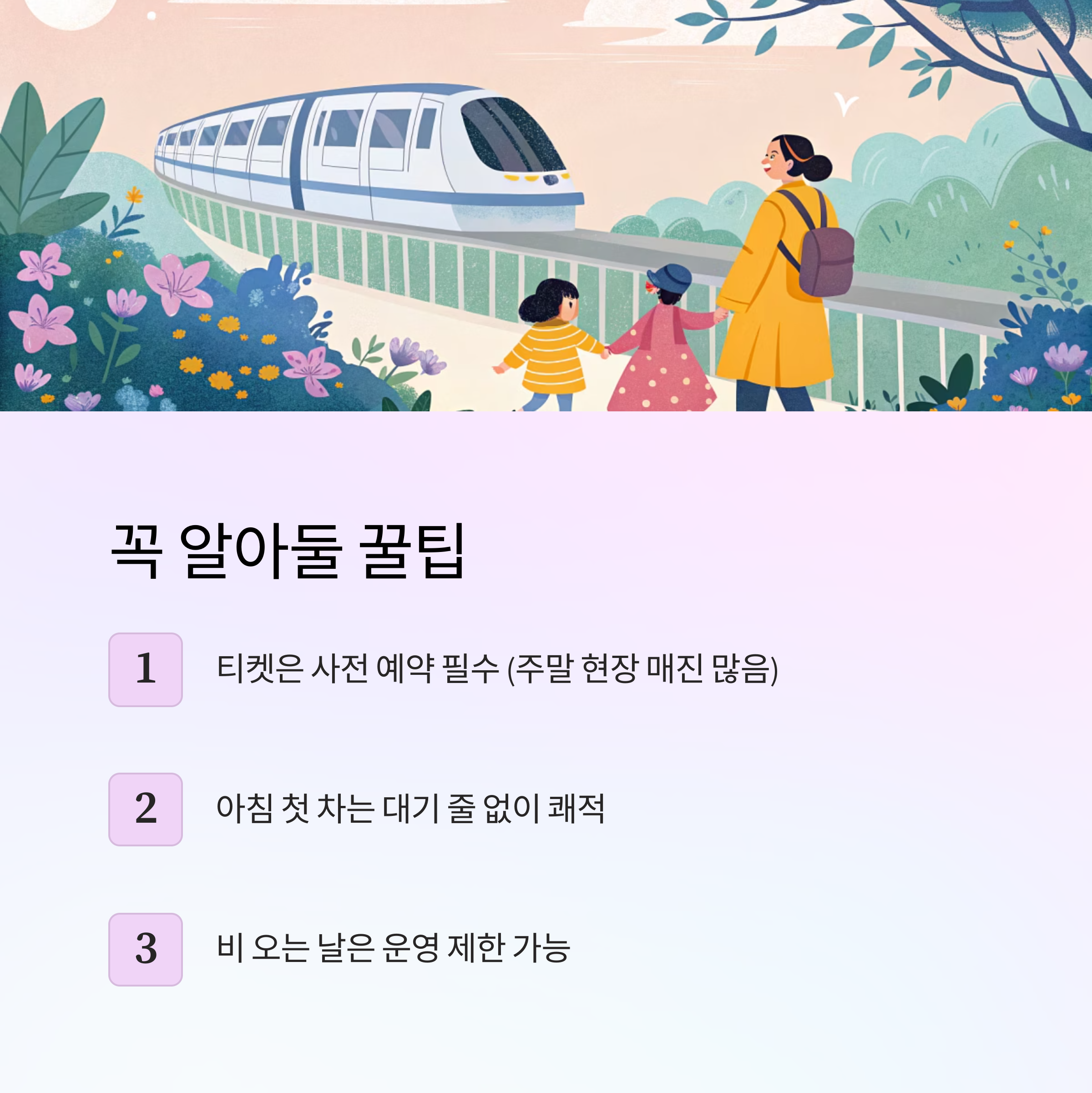 1. 티켓은 꼭 사전 예약하세요. 특히 주말에는 현장 매진이 많습니다. 2. 아침 첫 차를 이용하면 대기 줄 없이 쾌적하게 탑승 가능합니다. 3. 비 오는 날에는 운영이 제한될 수 있으므로 기상 정보를 미리 확인하세요. 4. 유모차는 탑승장에 보관하거나 접어서 실어야 하므로 준비가 필요합니다. 5. 사진 명소는 상단역에서 하차 후 ‘자작나무 숲길’ 방향으로 이동하세요. 이 팁만 알고 있어도 모노레일 이용이 훨씬 수월하고, 전체 여행 동선도 부드럽게 연결할 수 있습니다.
