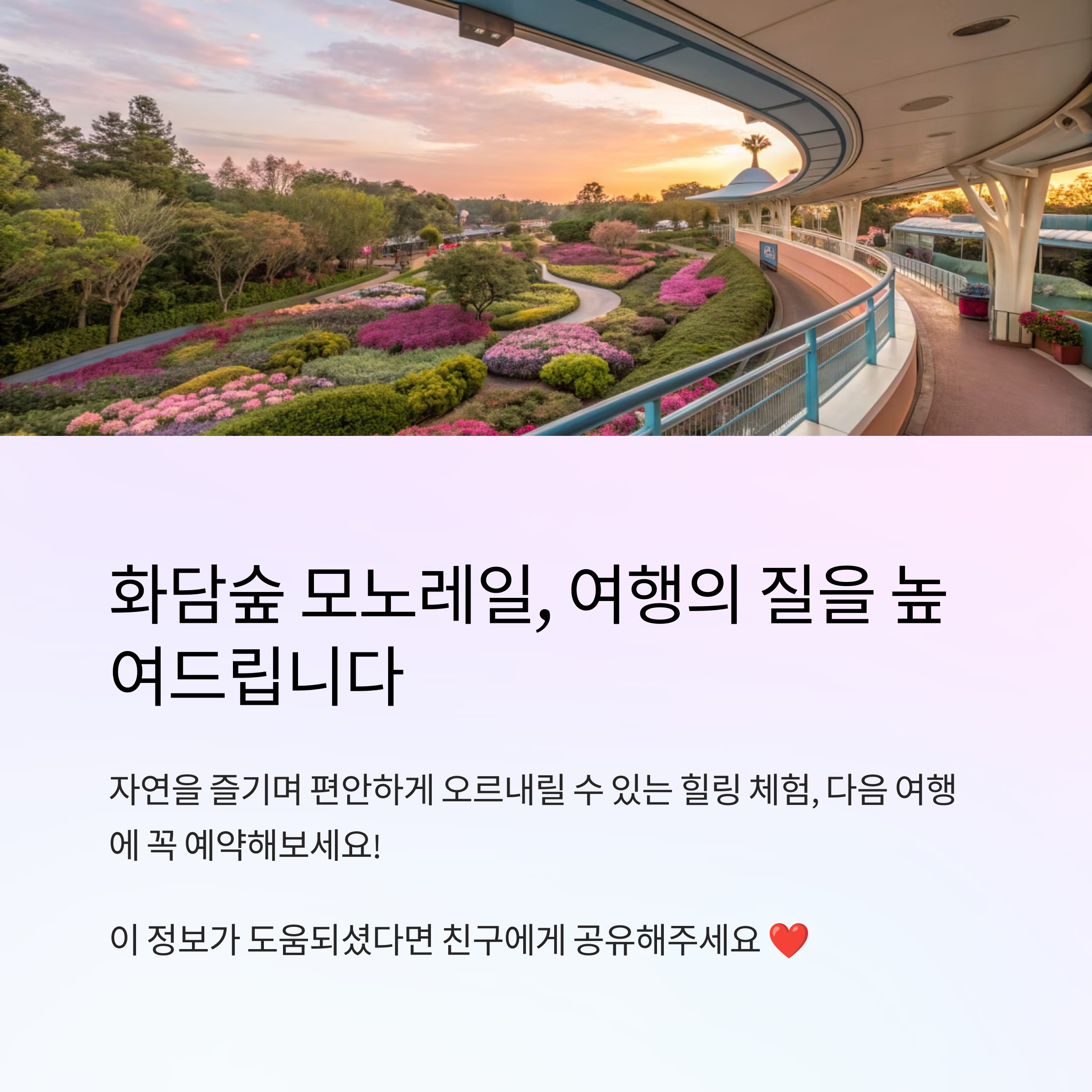 화담숲은 평지와 산지가 함께 어우러진 공간이다 보니 모든 코스를 도보로 둘러보기엔 체력적인 부담이 있습니다. 하지만 모노레일을 이용하면 이런 걱정은 싹 사라집니다. 자연을 즐기며 편안하게 오르내릴 수 있는 유일한 방법이자, 가족 모두가 함께 탈 수 있는 힐링 체험으로 화담숲 모노레일은 여행의 질을 한 단계 끌어올려줍니다. 이번 방문 계획 중이라면 반드시 모노레일 티켓 예약부터 시작해 보세요. 후회 없는 선택이 될 것입니다.