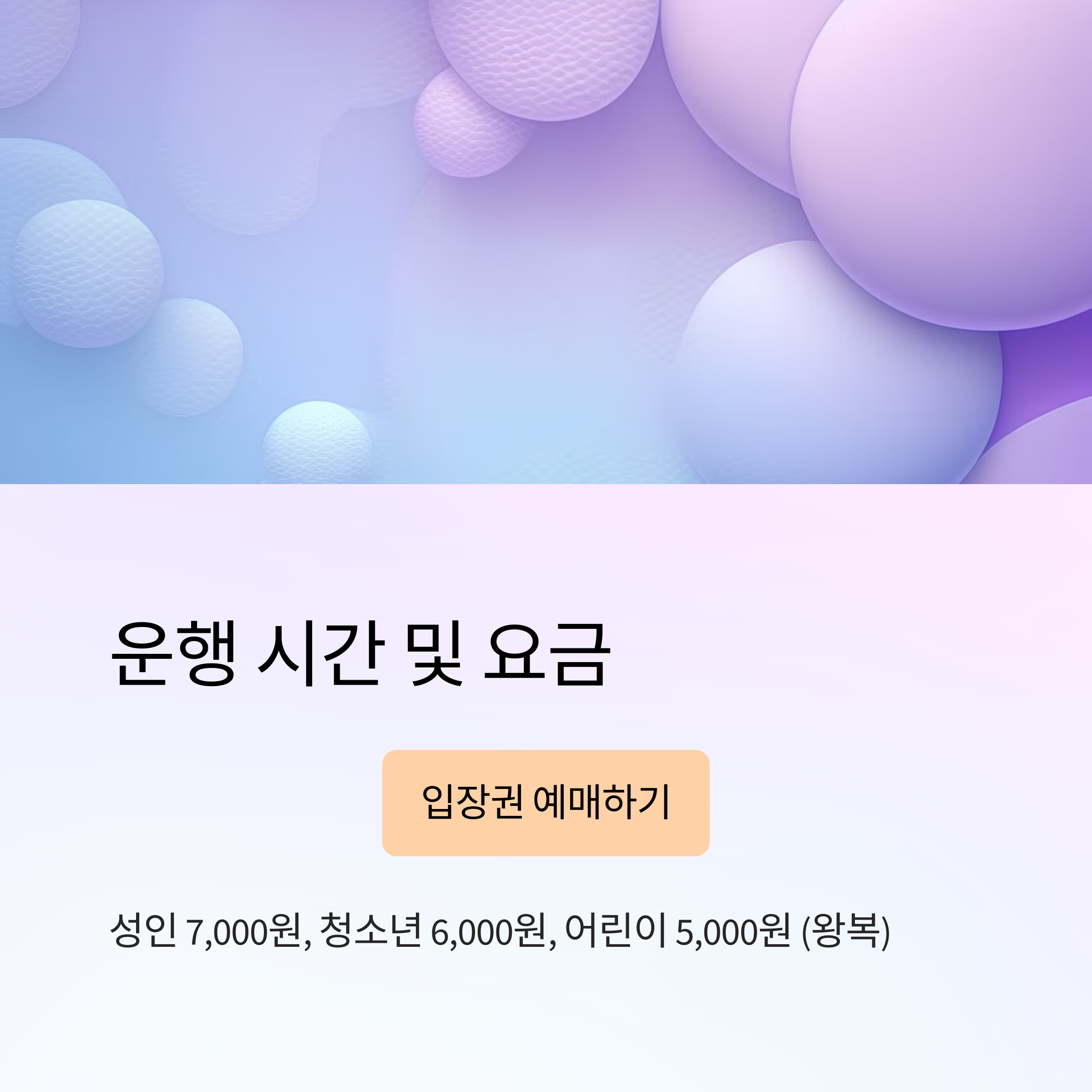 운영 시간은 계절별로 변동이 있을 수 있으나, 대체로 오전 9시부터 시작하여 오후 6시까지 운행합니다. 운행 간격은 평균 10분이며, 성수기에는 대기 인원에 따라 유연하게 배차 간격이 조정되기도 합니다.