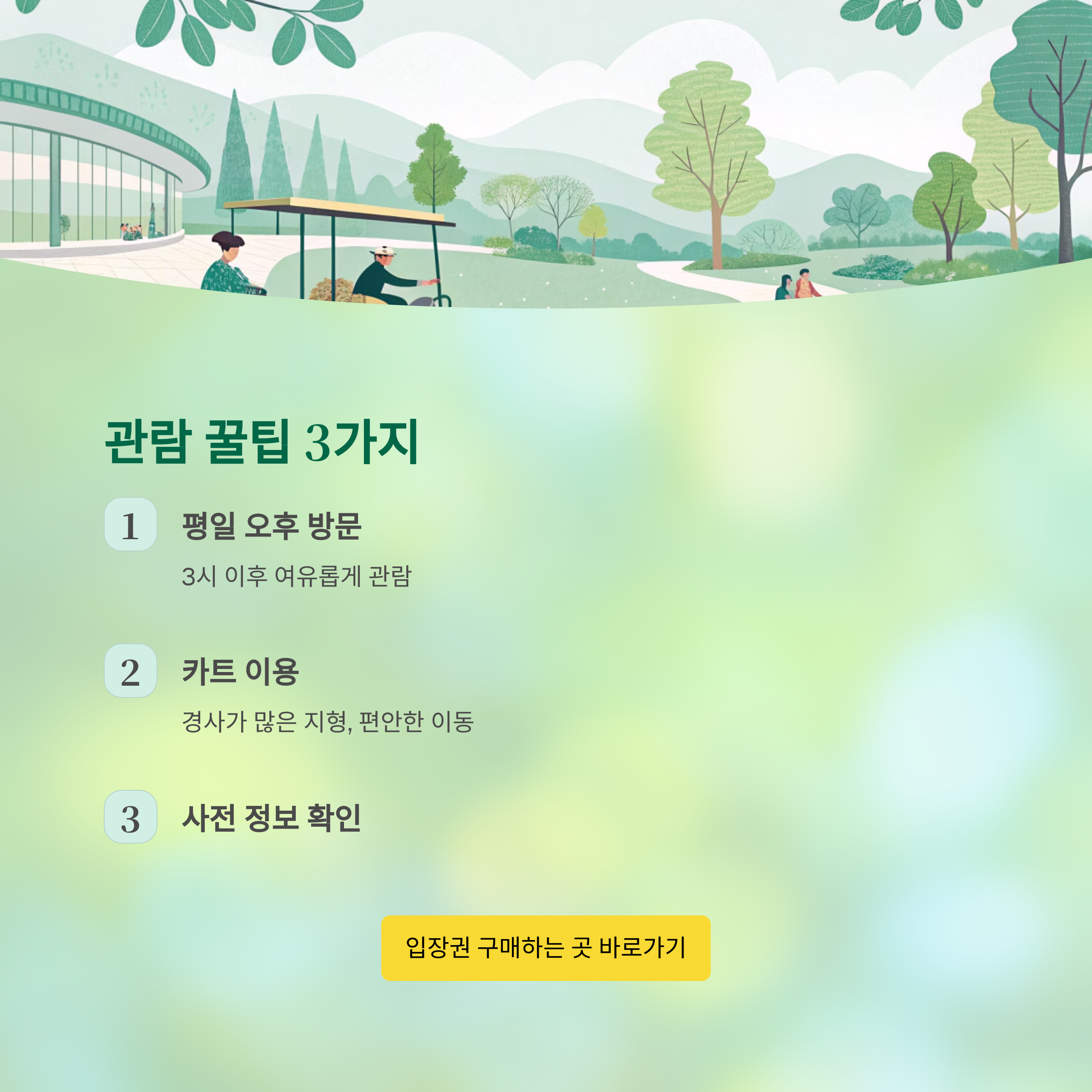 첫째, 평일 오후 시간대를 선택하세요. 주말 오전에는 주차장도 혼잡하고 내부도 북적이므로, 평일 오후 3시 이후가 상대적으로 한산하고 여유롭게 관람할 수 있습니다. 둘째, 카트 이용을 적극 추천합니다. 화담숲은 경사가 많은 편이라, 특히 노약자나 어린이와 함께인 경우 카트 탑승을 이용하면 훨씬 편안하게 이동할 수 있습니다. 셋째, 관람 전 화담숲 공식 홈페이지나 SNS를 확인하세요. 날씨, 야간 개장 일정, 특별 이벤트 등을 사전에 체크하면 더 알찬 관람이 가능합니다.