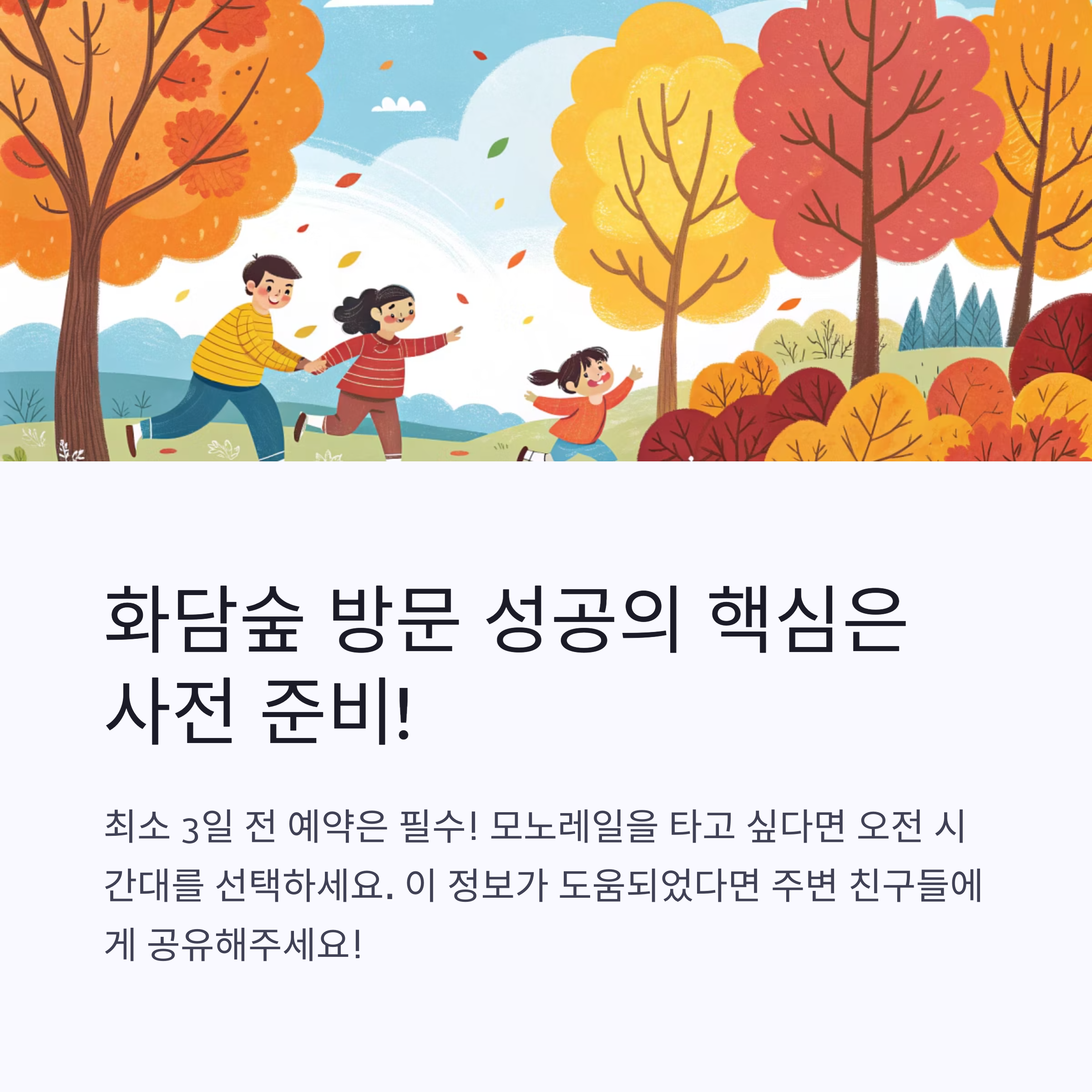 화담숲 모노레일은 입장권과는 별도로 '현장 예약'이 원칙입니다. 즉, 입장 자체는 사전 온라인 예약으로 해결해야 하지만, 모노레일은 입장 후 현장에서 예약을 진행하게 됩니다. 모노레일 탑승 인원도 제한이 있어, 이른 시간대 입장객에게 우선권이 돌아가므로 오전 9~10시 사이 방문이 모노레일을 타고자 하는 가족에게 가장 유리한 시간입니다.