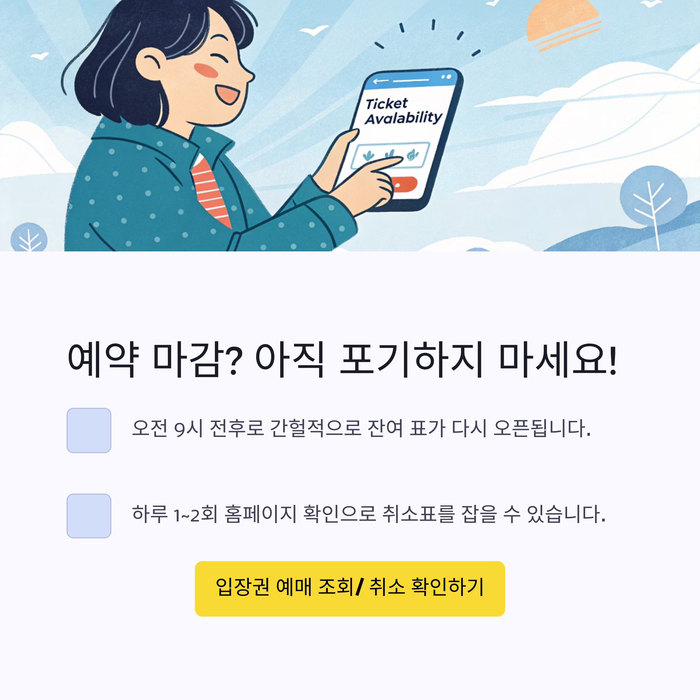또한 예약 시 입력한 정보(이름, 전화번호)와 실제 입장 시 제시할 신분증 정보가 일치해야 하므로, 대리 예약 시 반드시 동반 여부를 확인해야 합니다.