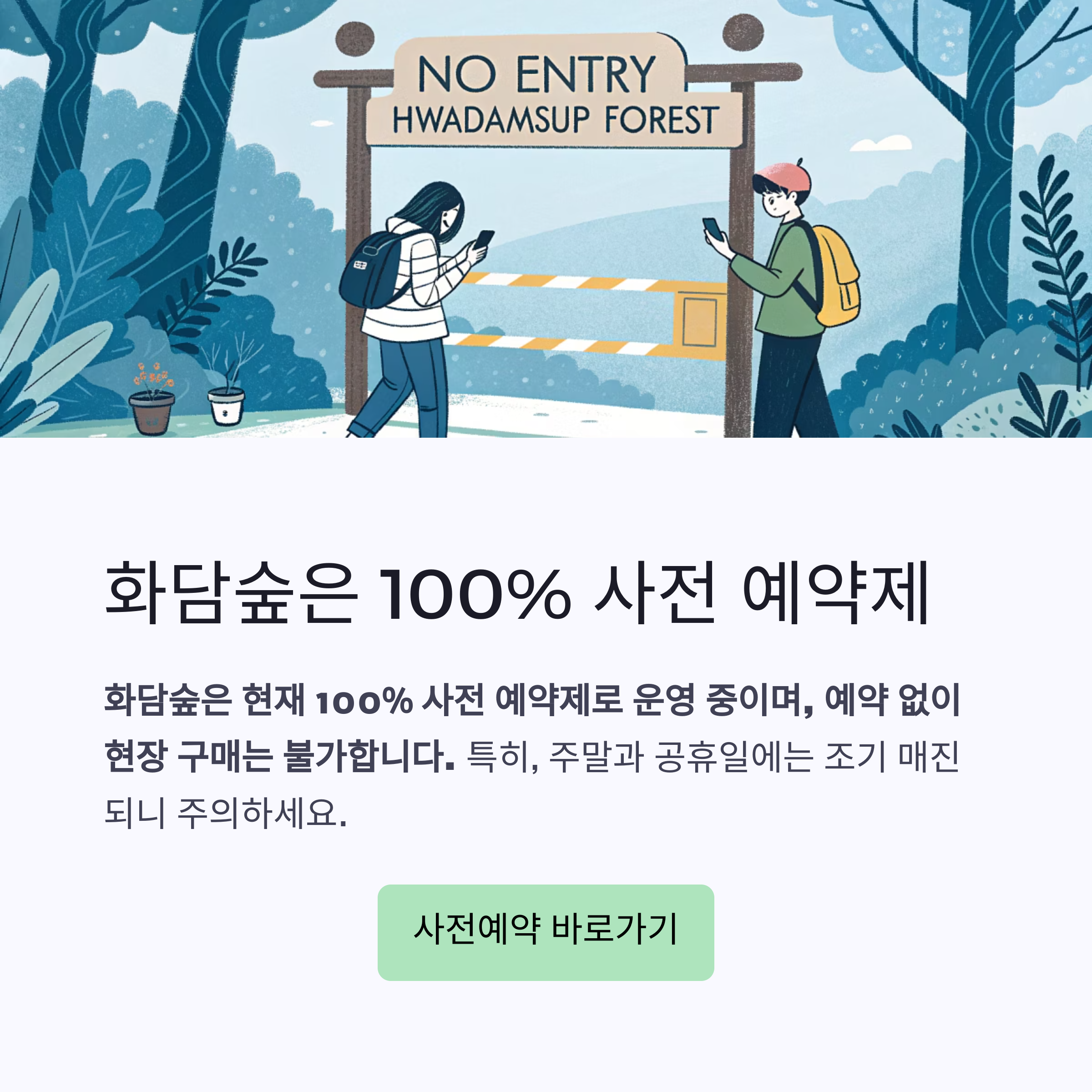 결론부터 말씀드리면, **화담숲은 현재 '100% 사전 예약제'를 운영 중이며, 예약 없이 현장 구매는 불가**합니다. 특히 주말과 공휴일, 단풍철과 같은 성수기에는 하루 수용 가능 인원이 사전 매진되기 때문에, 예약 없이 방문했다가 입장하지 못하는 경우가 실제로 자주 발생하고 있습니다. 따라서 "가다가 표 사면 되겠지"라는 생각은 매우 위험한 접근입니다.