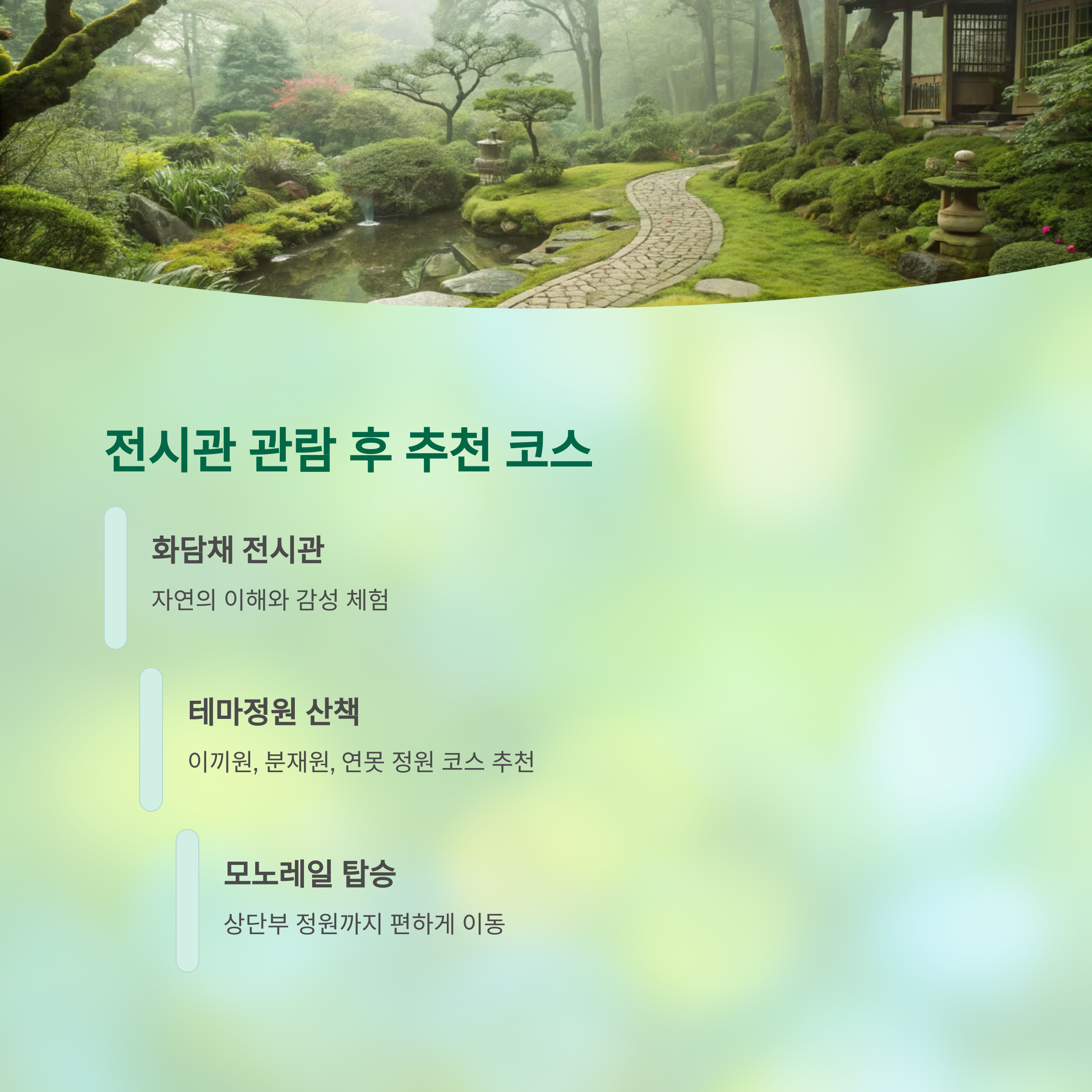 화담채 전시관 관람이 끝난 후에는 바로 인근의 테마정원 구간을 산책하기 좋습니다. 특히 ‘이끼원’, ‘분재원’, ‘연못 정원’ 코스가 전시관 분위기와 잘 어울려 힐링 산책 코스로 적합합니다. 또는 인근 모노레일 탑승장으로 이동해 상단부 정원까지 바로 올라갈 수도 있어 체력에 따라 동선을 다양하게 조절할 수 있습니다. 근처에 간단한 음료와 간식 등을 판매하는 카페도 있으니, 여유 있는 일정 계획에 도움이 됩니다.