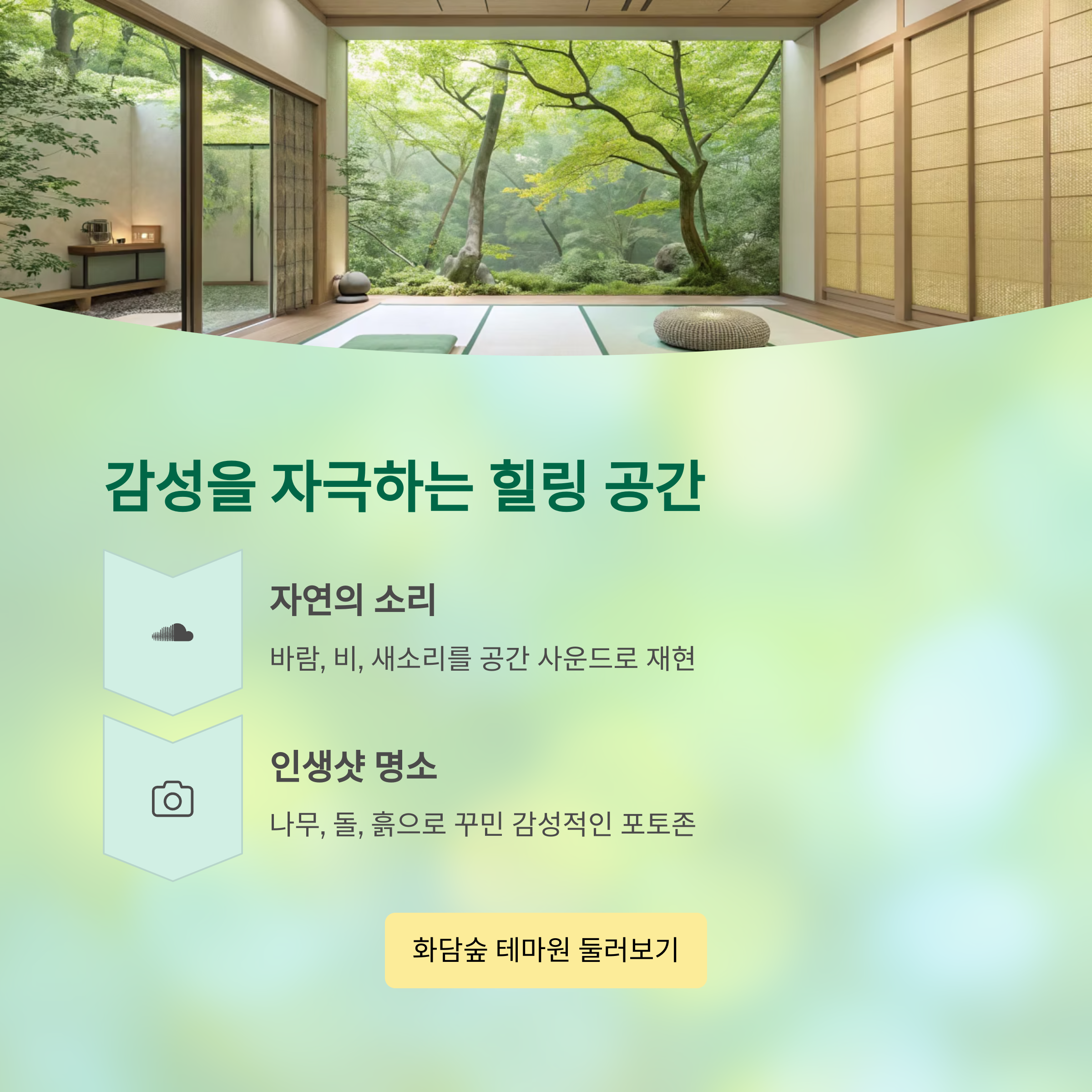 | 소리의 방 | 숲속 자연의 소리를 테마로 한 청각 중심 체험 공간 |