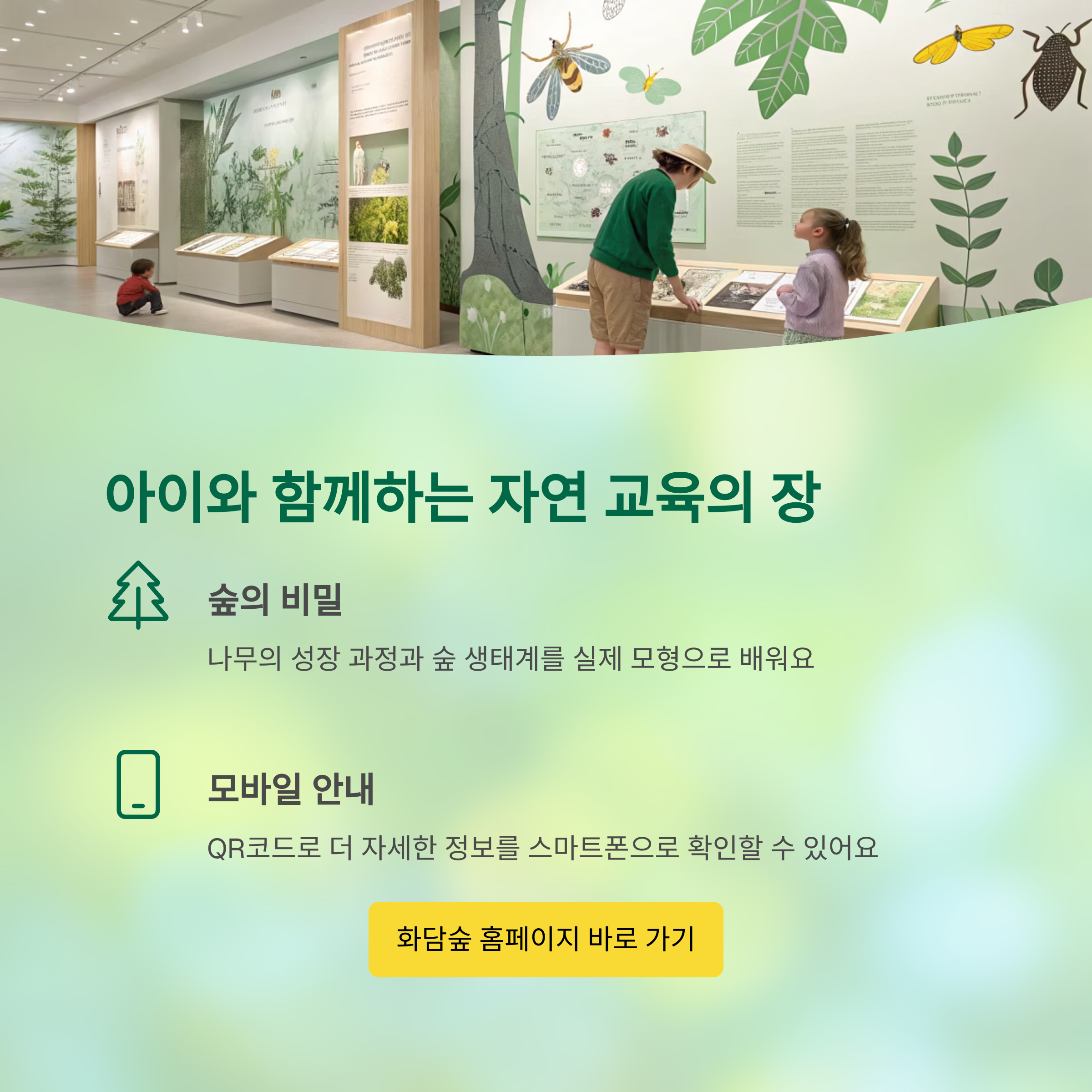 화담채 전시관은 단순히 전시물을 관람하는 공간이 아닌, 참여와 체험을 유도하는 구조로 되어 있어 자녀들과 함께 방문하기 좋습니다. '숲의 비밀' 코너에서는 나무의 성장 과정, 곤충과 식물의 공생 관계 등을 실제 모형과 함께 설명해 줍니다. QR코드를 활용한 모바일 안내 시스템도 준비되어 있어 초등학생 이상의 아이들도 흥미롭게 접근할 수 있도록 구성되어 있습니다. 부모 입장에서는 자연에 대해 함께 배울 수 있는 좋은 기회입니다.