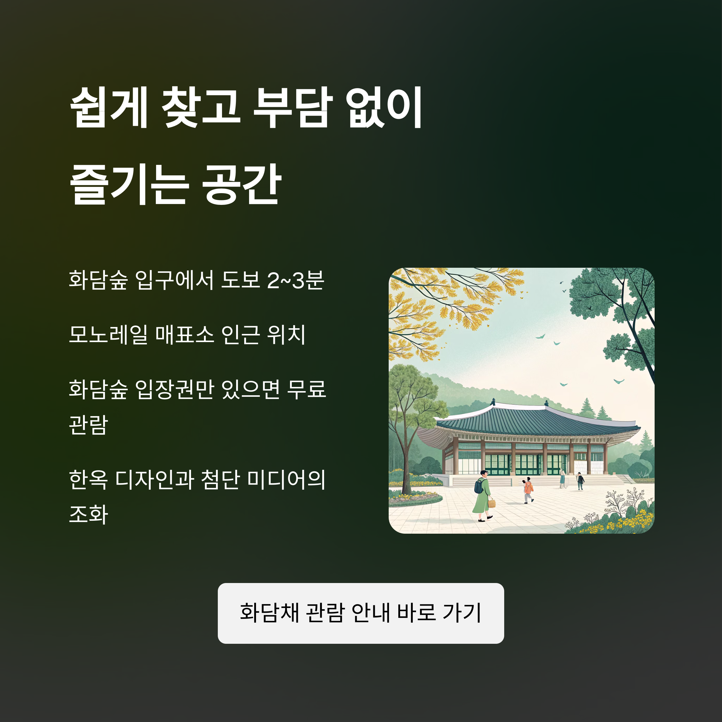 | 무료 입장 | 화담숲 입장권만 있으면 추가 비용 없이 관람 가능 |