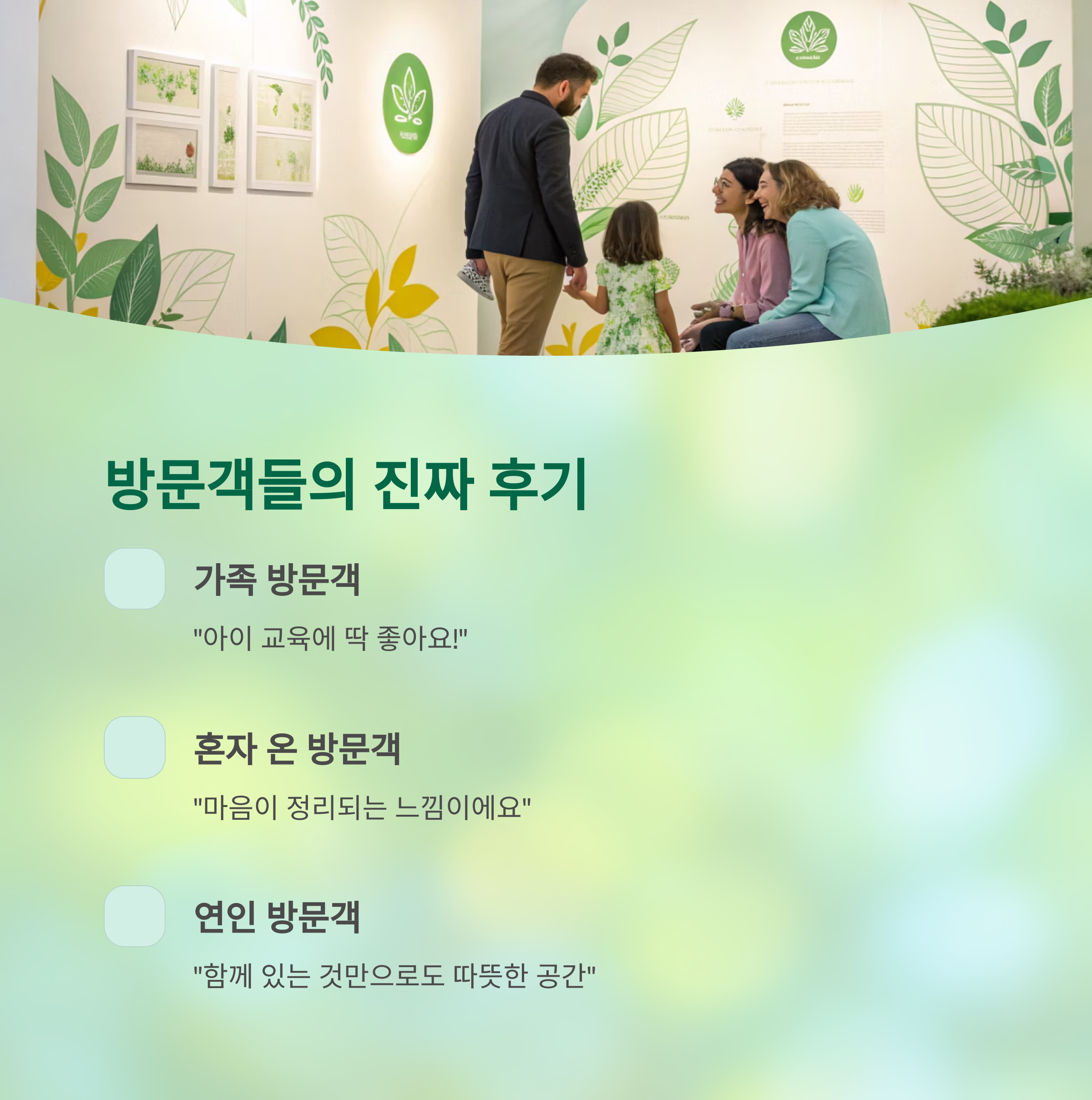 직접 방문해 본 후 가장 인상 깊었던 점은 공간의 조용함과 안정감이었습니다. 단순히 시각적 전시에 그치지 않고, ‘자연이 주는 감정’을 오롯이 느낄 수 있도록 구성된 점이 인상 깊었으며, 아이와 함께 방문한 가족들은 "아이 교육에 딱 좋다"는 반응을 보였습니다. 혼자 온 방문객들은 “마음이 정리되는 느낌”이라고 표현했으며, 연인 방문객은 “함께 있는 것만으로도 따뜻한 공간”이라며 감성적인 리뷰를 남기기도 했습니다.