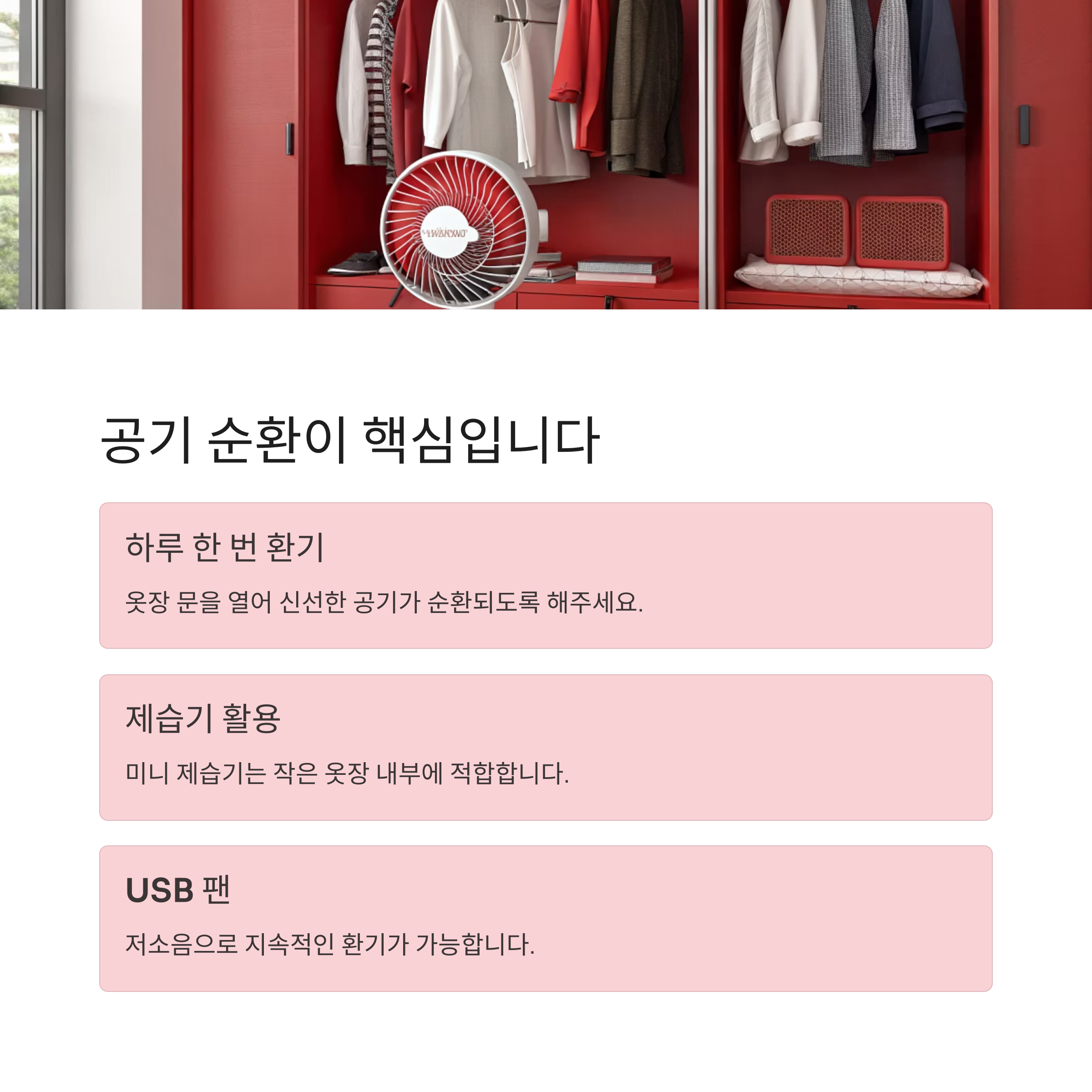 | USB 팬 | 저소음, 지속적 환기 가능 | 벽장, 붙박이장 |
