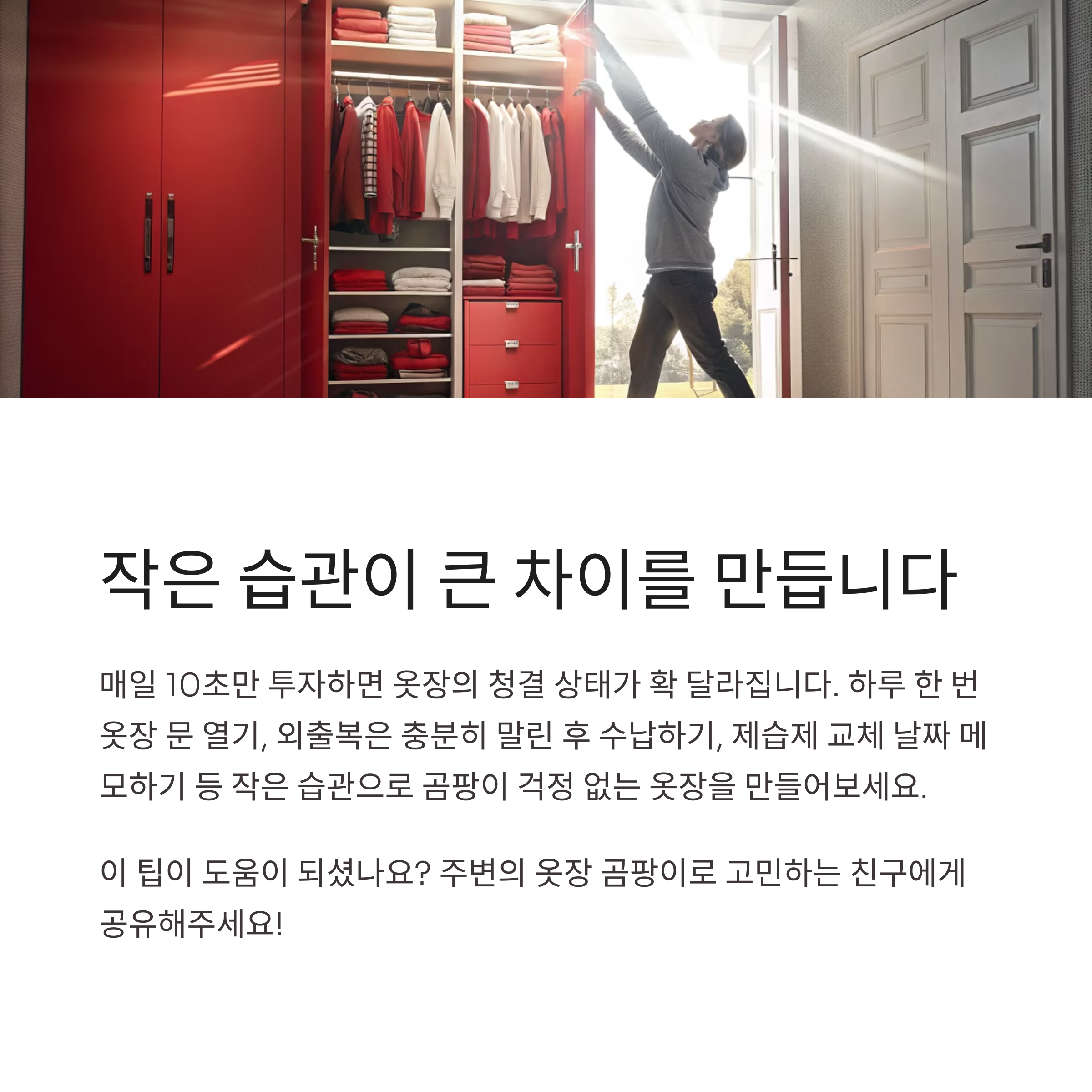 아무리 좋은 제품을 써도, 결국은 평소 습관이 곰팡이를 막는 열쇠입니다. 아주 간단한 실천만으로도 옷장의 청결 상태는 확 달라질 수 있어요. 매일 10초만 투자해 보세요.