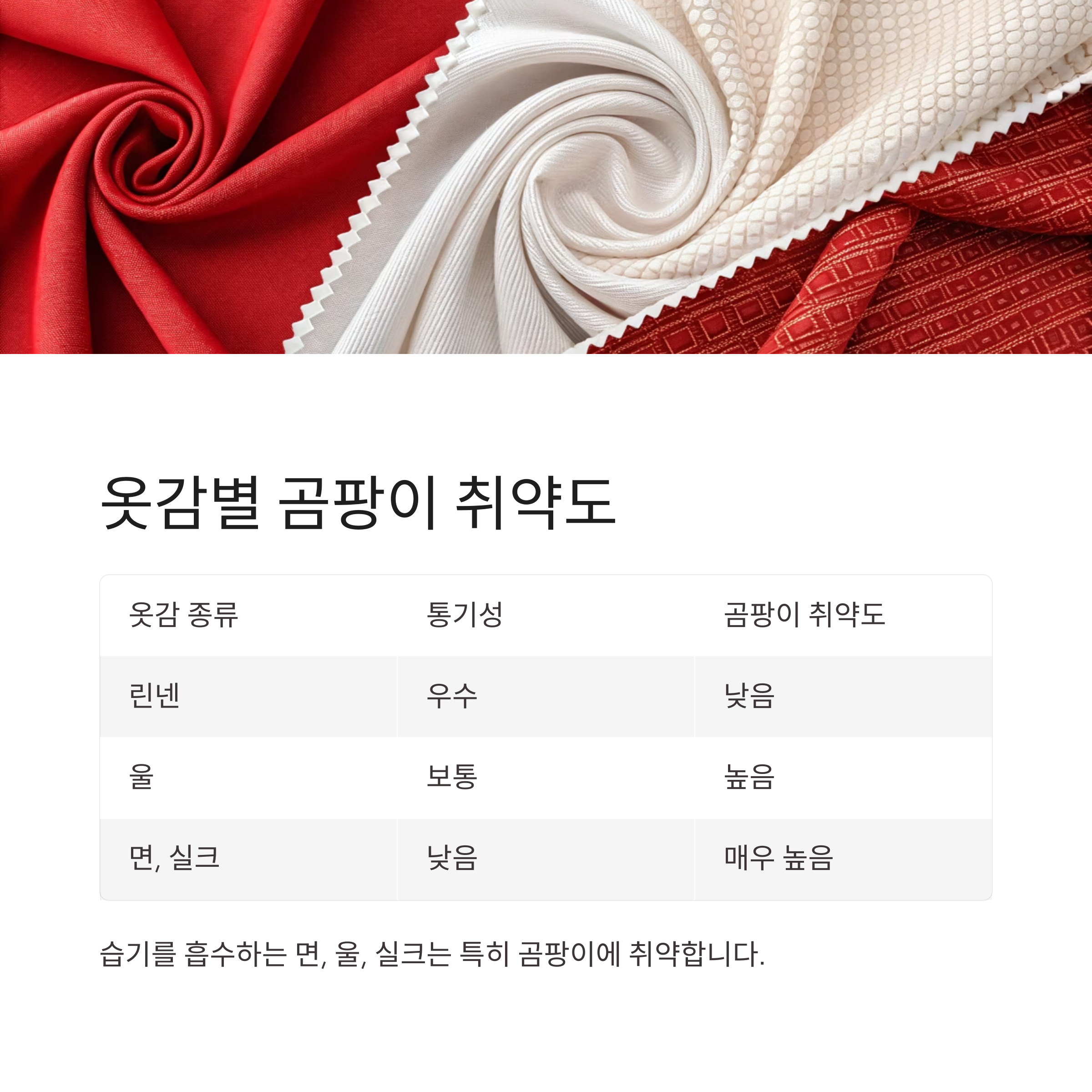 모든 옷이 동일하게 곰팡이에 취약한 건 아니에요. 통기성이 좋은 리넨이나 폴리에스터 계열은 비교적 안전한 반면, 면이나 울, 실크처럼 습기를 흡수하는 섬유는 특히 조심해야 합니다. 아래는 섬유 종류별 곰팡이 취약도를 정리한 표입니다.