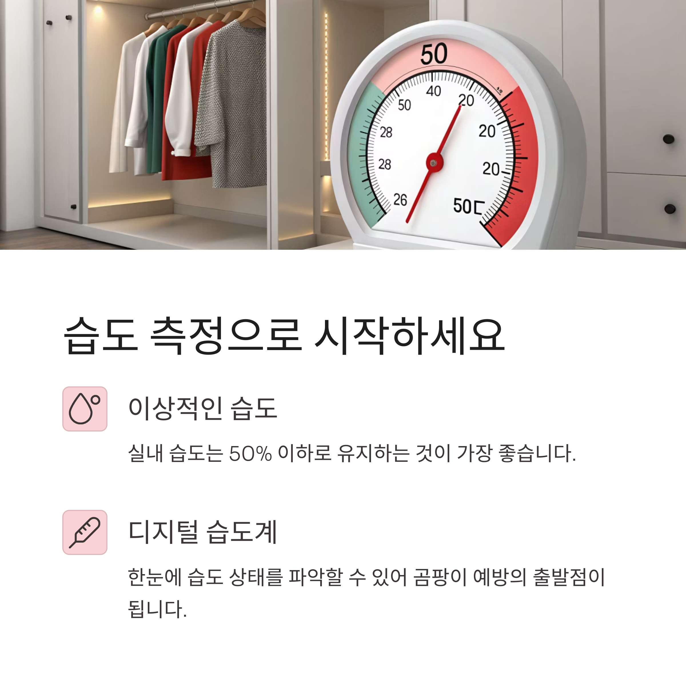 곰팡이의 가장 큰 원인은 바로 '습기'입니다. 옷장 안이 꿉꿉하게 느껴진다면 이미 곰팡이 발생 조건은 충족된 셈이죠. 실내 습도는 50% 이하로 유지하는 것이 가장 이상적이며, 특히 옷장 내부는 자주 열지 않기 때문에 그 습기가 쉽게 빠지지 않습니다. 이런 이유로 디지털 습도계를 하나 마련해 두는 것을 추천드려요. 한눈에 습도 상태를 파악할 수 있고, 숫자로 확인할 수 있어 곰팡이 예방의 출발점이 됩니다.